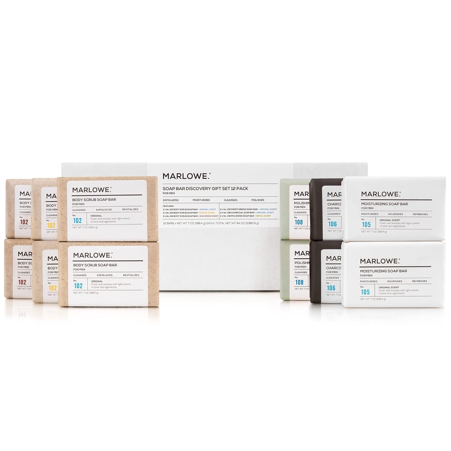 - Body Soap Discovery Pack: This 12 pack soap bar variety offers trial and rotation of 4 bar soap formulas with and without grit, and 4 different manly scents including woodsy Marlowe Original, Oud Wood, Santal and Neroli