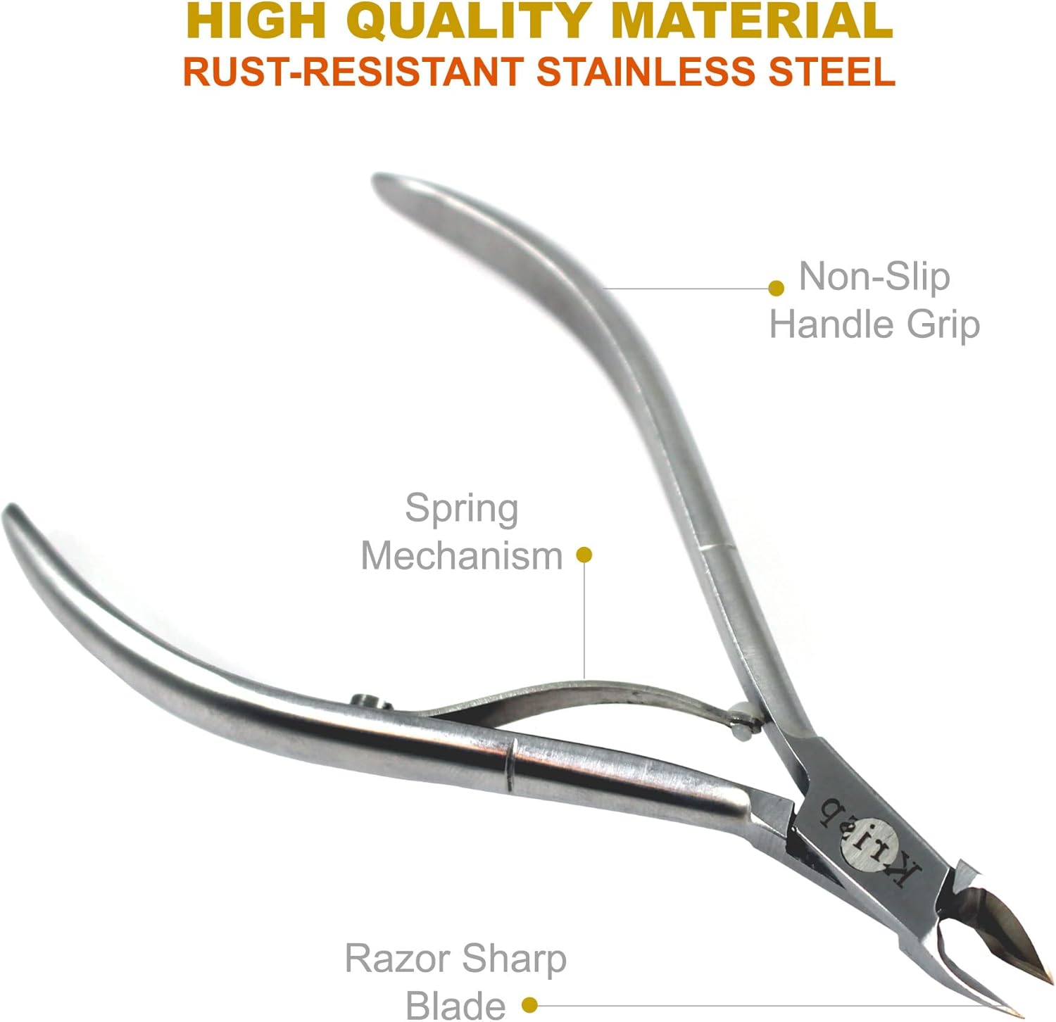 - ERGONOMIC & DURABLE - Ergonomic grip with protective coating provides enhanced rust resistance and increases tool-life; the coating also reduces friction, which contributes to durability and ease of use. Stainless steel nippers and cuticle pusher cuticle nipper half jaw professional cuticle trimmer professional cuticle nippers nail cuticle trimmer professional cuticle cutter stainless steel.