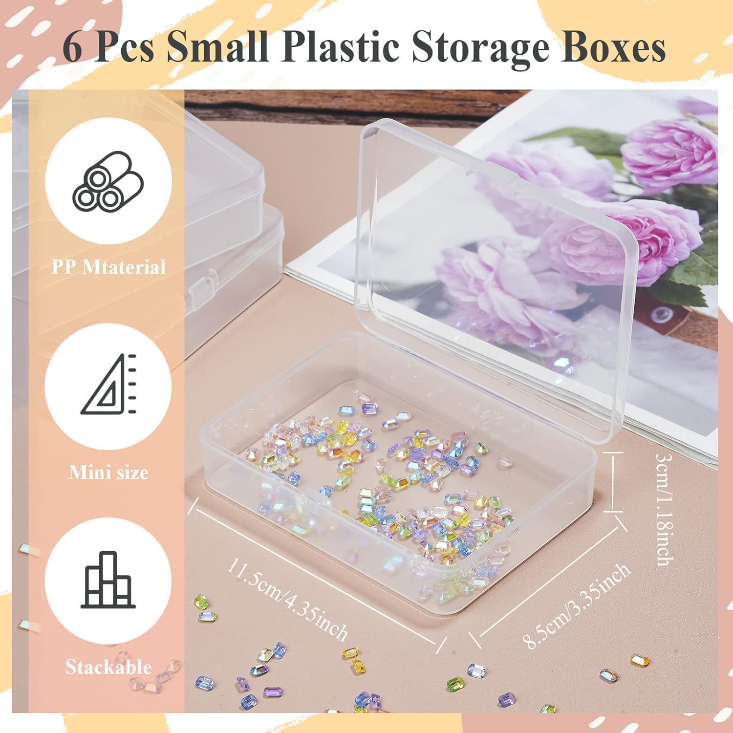 - Perfect small clear boxes for storing and organizing. Great for organizing crafts rhinestones, beads, bobby pins, jewelry findings, crayons, swabs, earplugs, dental floss, etc.