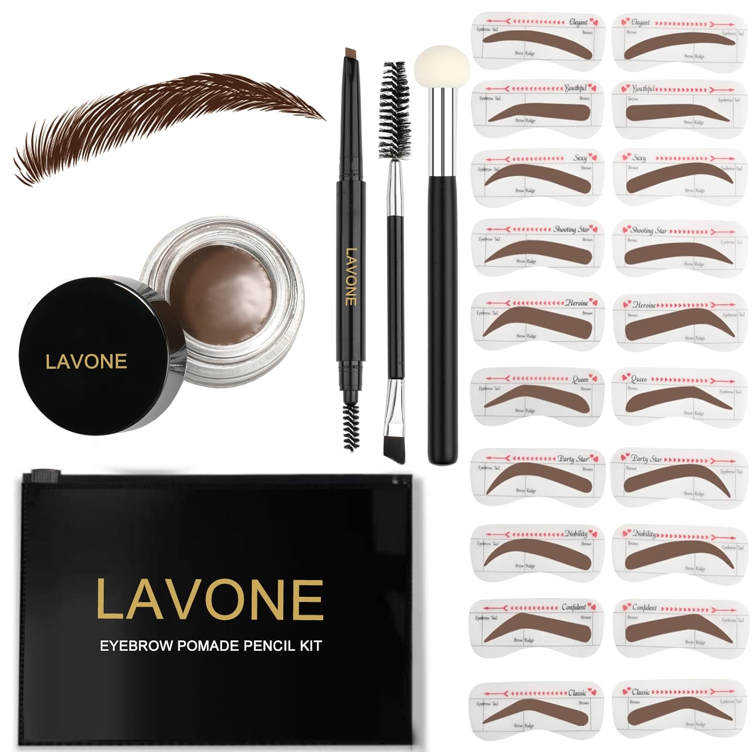 - [What’s in the eyebrow kit]: LAVONE makeup eyebrow kit includes brow pencil (color: dark brown), eyebrow powder(color: dark brown), 20 eyebrow stencils (10 different shapes), a sponge applicator, a dual precision brush and a zipper pouch for on the go.