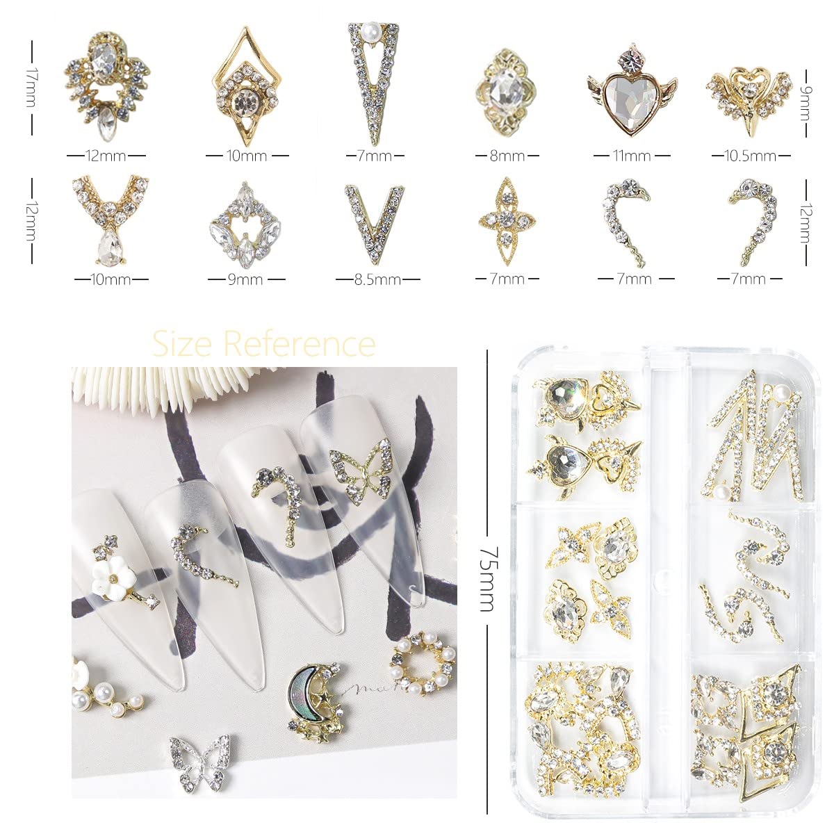 - â¤ă24Pcs 12 Pair exquisite Luxury Nail charms, romatic valentines nail charmsăYou will get 24pcs shiny gold Luxury nail gems and rhinestones like heart nail art studs total in 12 different design, 1 pair every desgin, giving you different nail designs every time. Stored in a transparent white box, enough quantities meet your daily design needs, make your nail to be charming and bling.