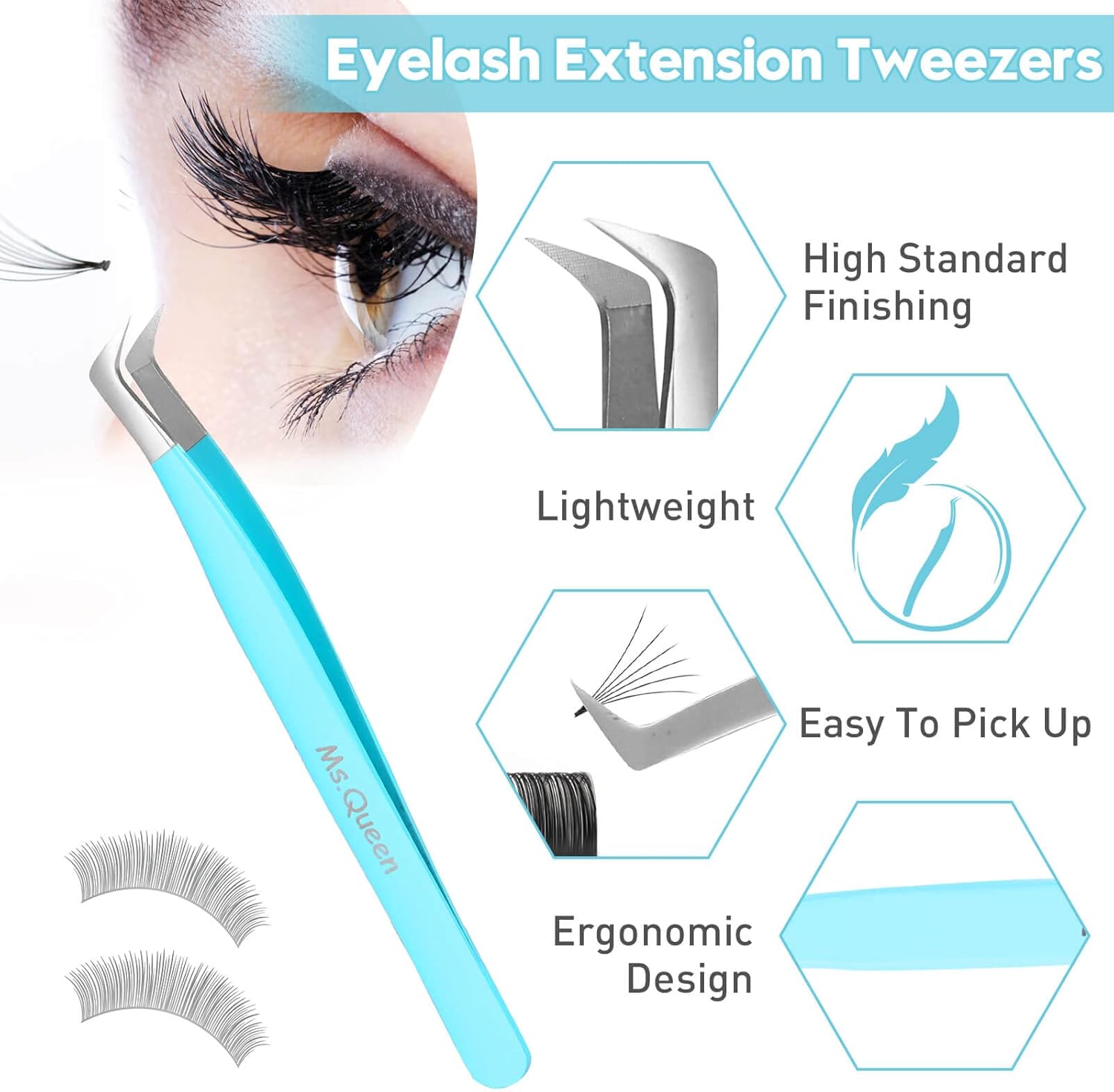 Ms.Queen Lash Tweezers for Eyelash Extensions,Professional 5Pcs Fiber Tip Curved Isolation 45 90 Degree Boot Volume Lash Tweezers for Extensions, Blue