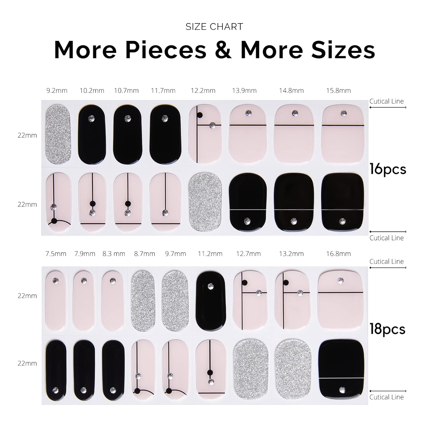 - 【34 PCS NAIL STRIPS】More Quantity & Sizes than Ever! - With 17 different sizes of our nail art stickers, you can easily find the right size to match your nails. - New curved side line fits even better with your nail shape for seamless adhesion.