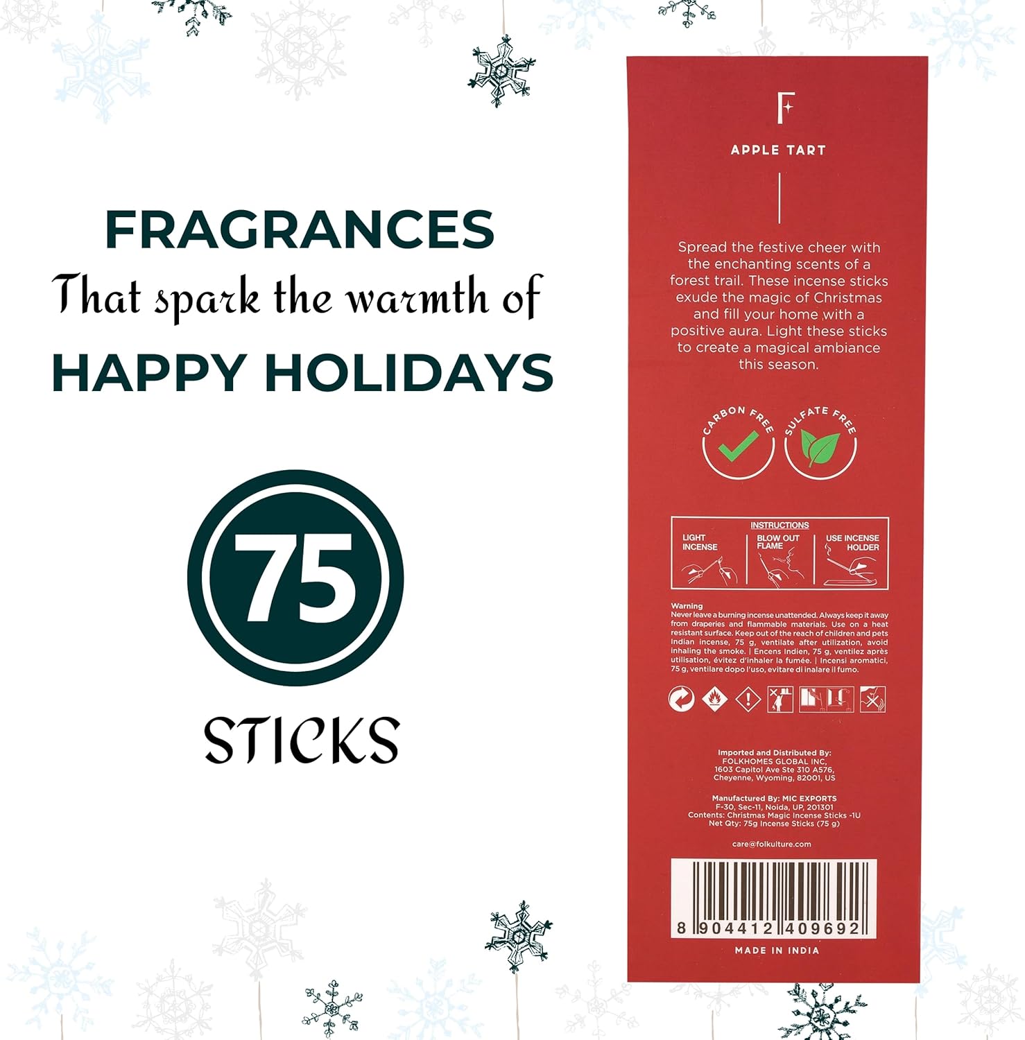 Folkulture Christmas Incense Sticks for Home | Pack of 75 Insenses for Cleansing | Natural and Non Toxic Insence Sticks for Gifts for her | Organic Apple Tart Inscents (Christmas Magic)