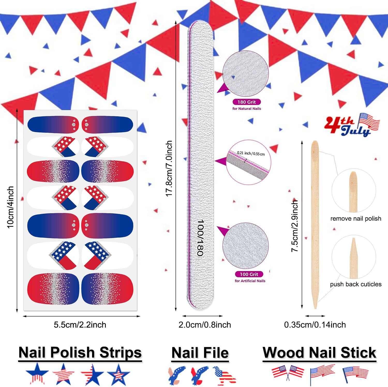 - [Package Included] You will get 16 sheets 4th of July nail strips, each nail strips has 14 pieces nail tips and 7 sizes, to suitable for most people's nail size. the attached nail file and cuticle stick will help you finish the nail work better.