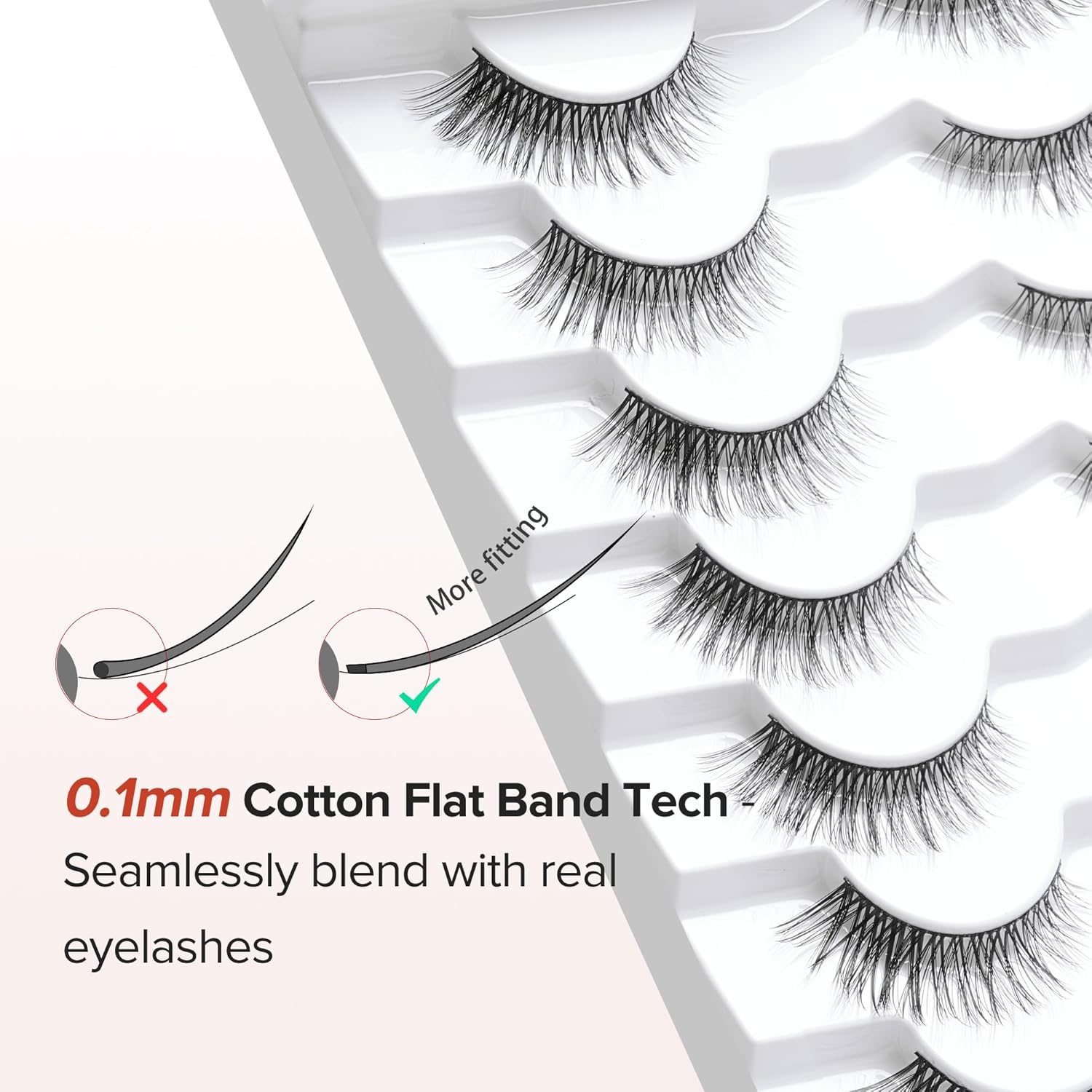 - THIN BAND FALSE EYELASHES: The wispy eyelashes use 0.1mm thin cotton flat band tech, seamlessly blend to your real eye lashes. Incredibly flexible, easy to bend and stay well on, beginner friendly