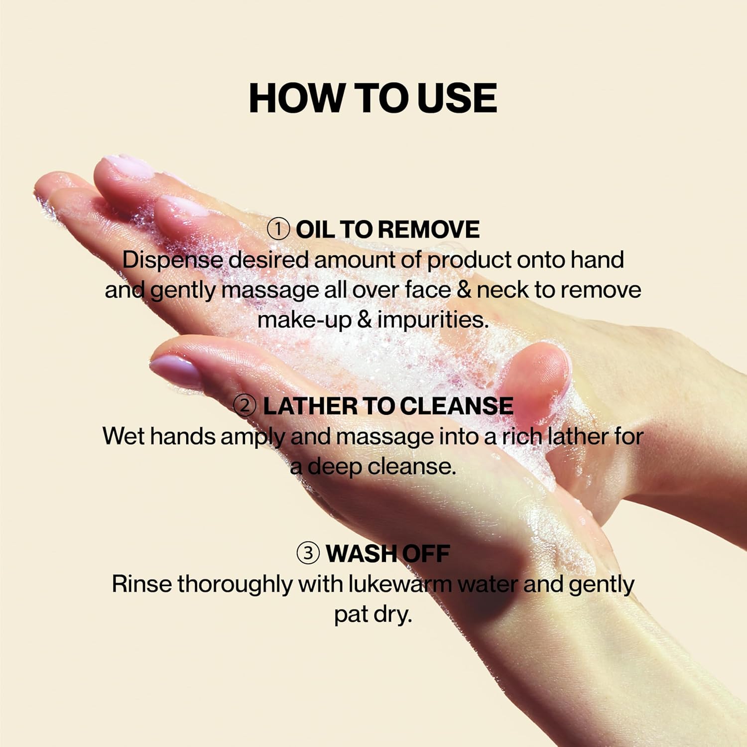 - Oil to Remove Dispense desired amount of product onto hand and gently massage all over face & neck to remove make-up & impurities.