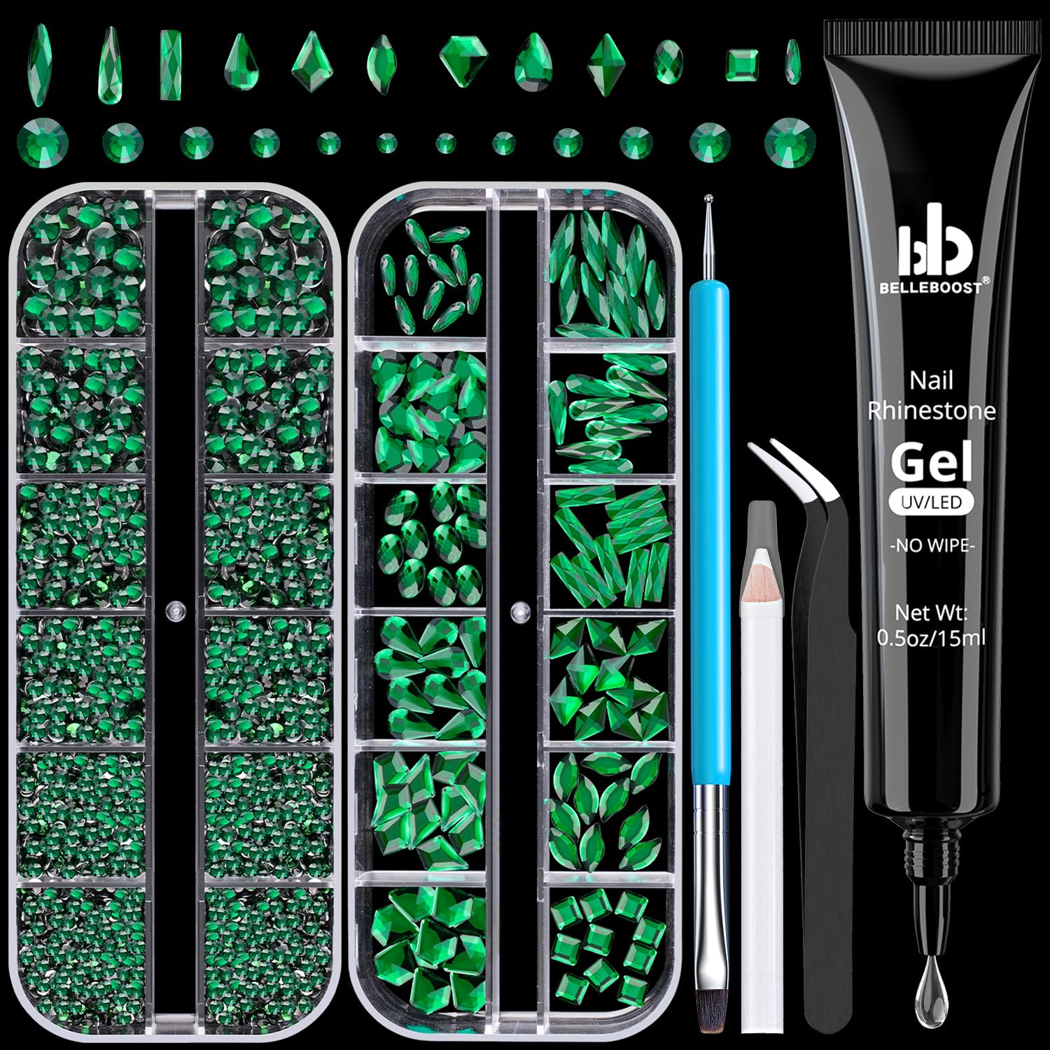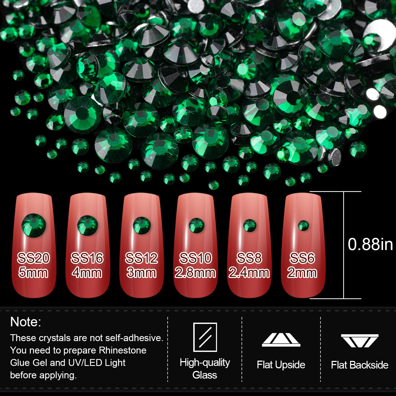 - 💎NAIL ART KIT: You will receive one box of round flatback glass nail charms in dark green color (2/2.4/2.8/3/4/5mm) and one box of multishaped flatback glass nail charms in dark green color. The functional tool kit for nail design is attached as well, which carries 1pcs 15ml rhinestone glue gel, 1pcs dual-end brush & dotting pen, 1pcs pickup pencil, and 1pcs tweezer.
