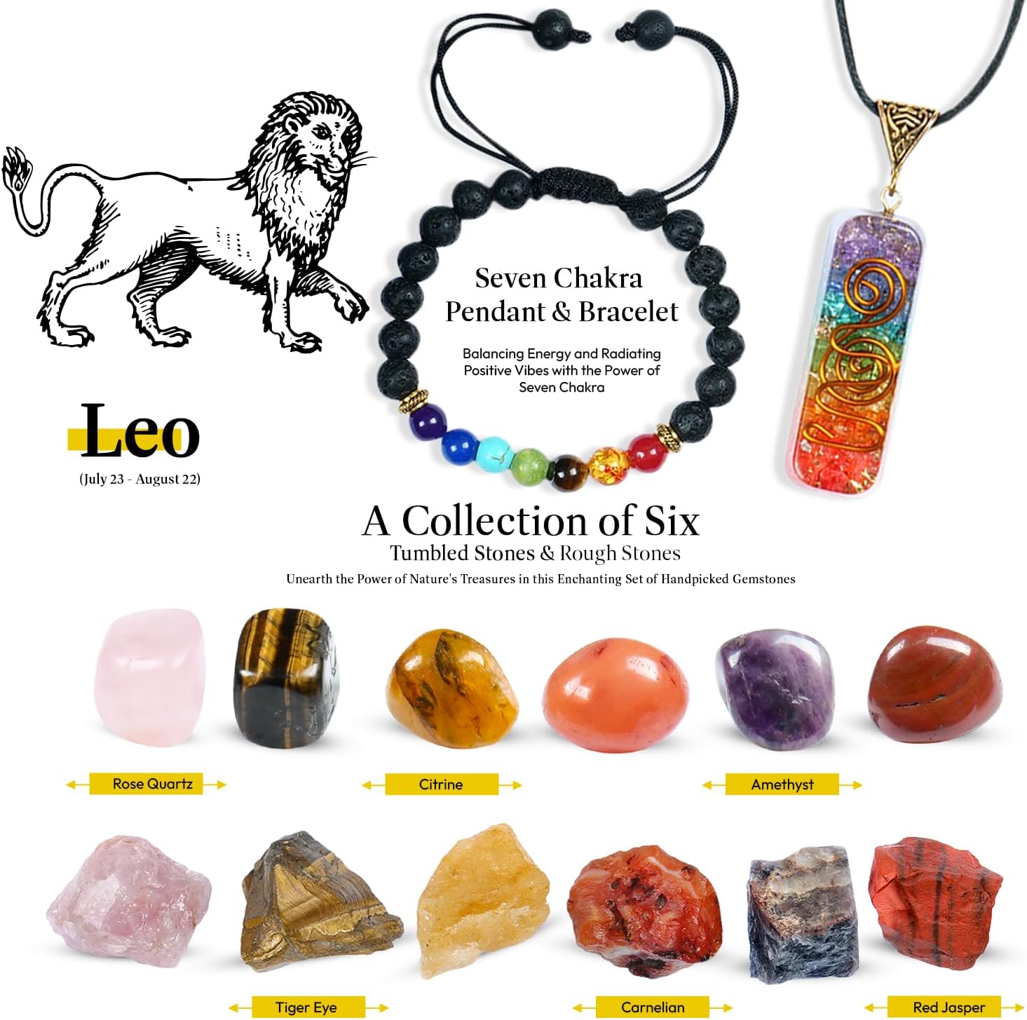 - Leo Zodiac Kit - This zodiac leo healing crystals set contain 6 natural healing rough stones and 6 polished tumble stone with beautiful seven chakra pendant and chakra bracelet. Which are connected to healing and positive energy properties of leo zodiac sign.