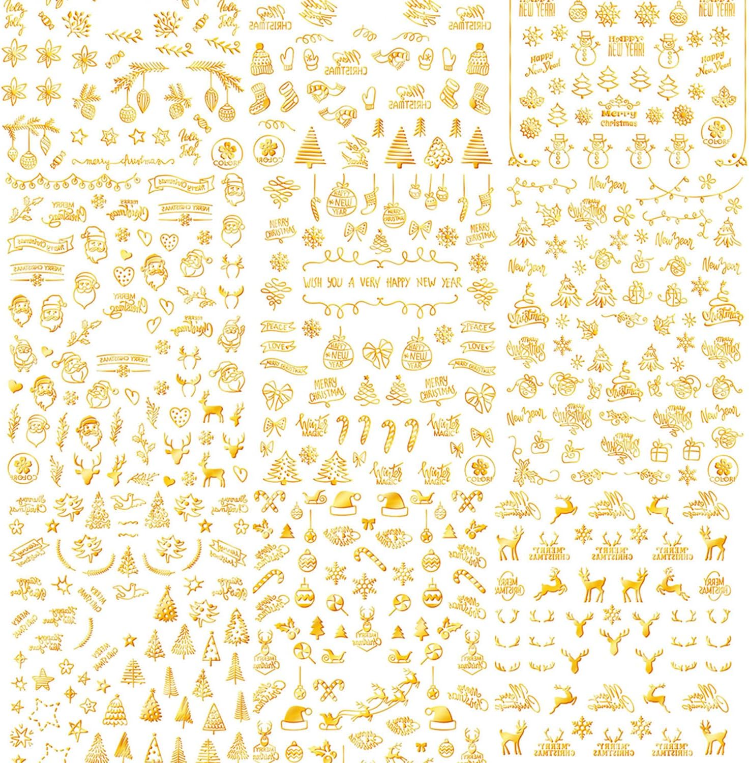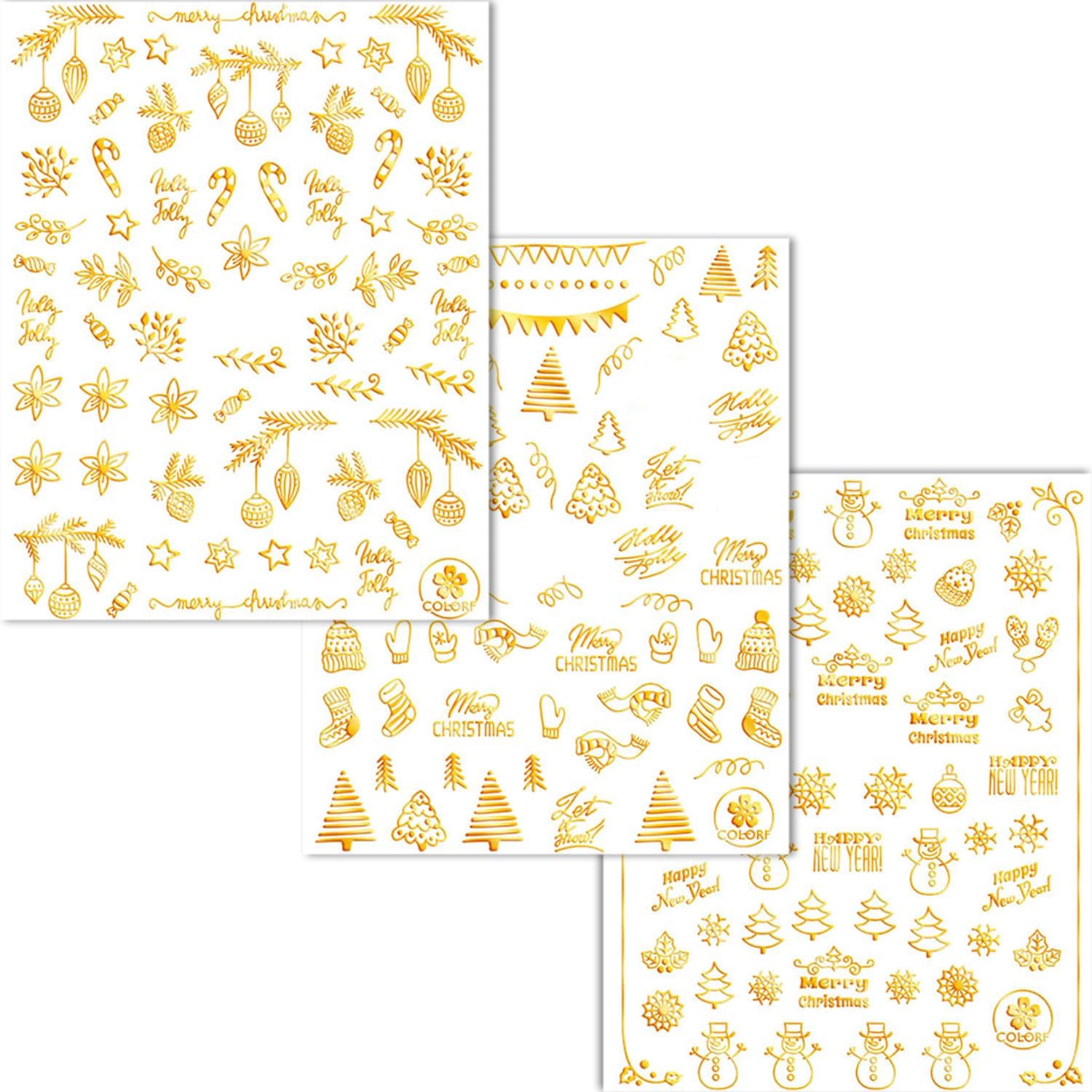 HNUIX Nail Stickers - 3D Christmas, Self Adhesive Nail Decals, Multi Pattern, Gold, 9 Sheets, for Nail Art
