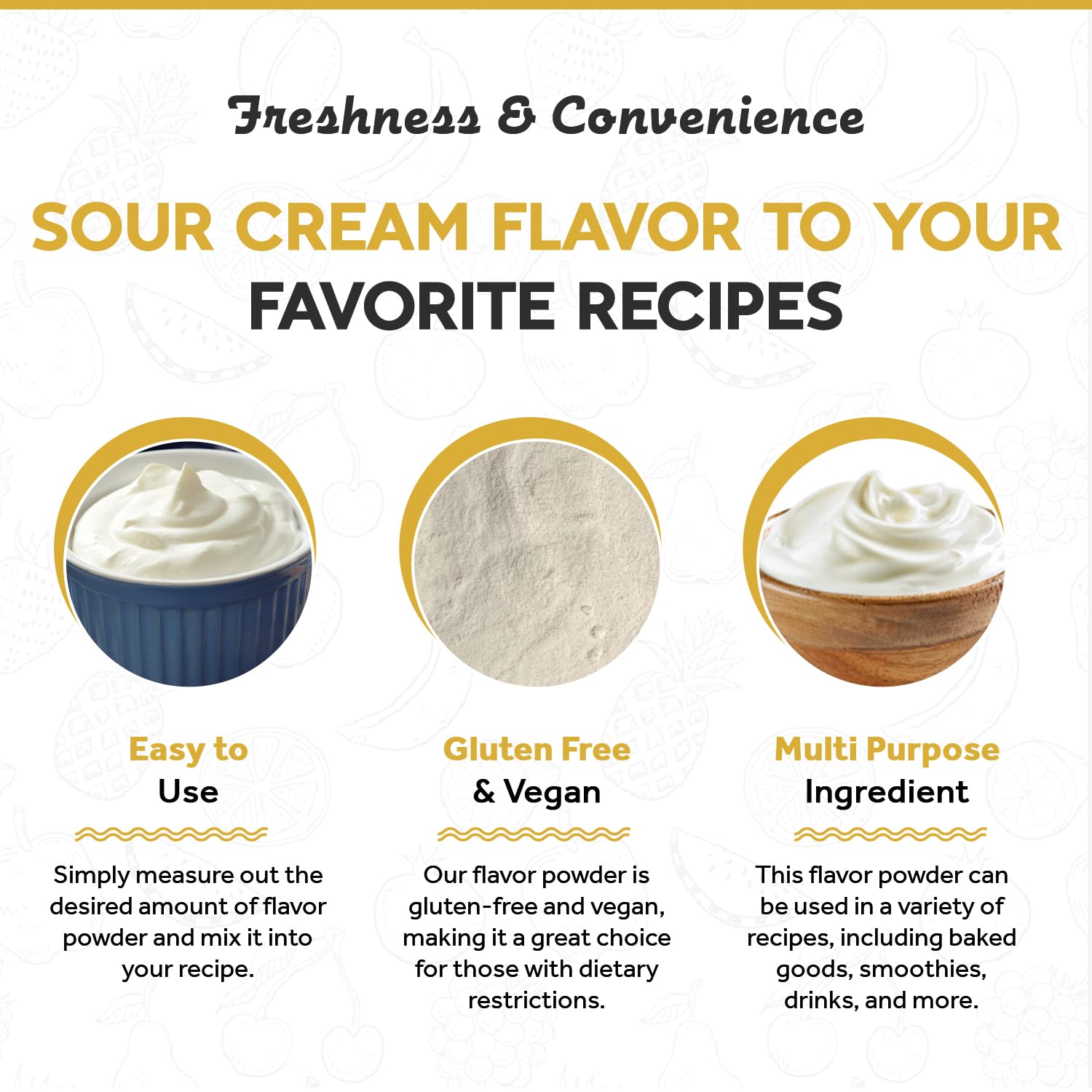 - ๐๐ฅ๐ฎ๐ญ๐๐ง-๐๐ซ๐๐ ๐๐ง๐ ๐ฏ๐๐ ๐๐ง: Our Sour Cream flavor powder is gluten-free and vegan, making it a great choice for those with dietary restrictions. It's a versatile ingredient that can be used in a wide range of recipes, including ones that are gluten-free or plant-based.