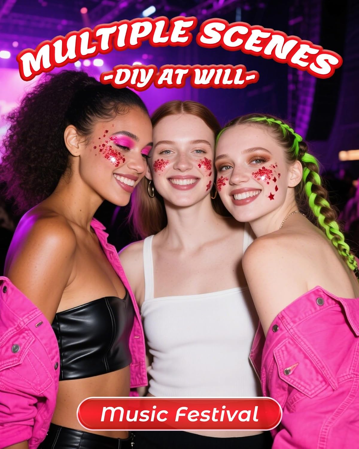 - VEGAN, SAFE & GENTLE: Hypoallergenic, and cruelty-free ingredients, our Red Face Glitter Gel is safe for all ages—even kids! It glides on comfortably without irritating skin and washes off easily with soap and water. Party with peace of mind