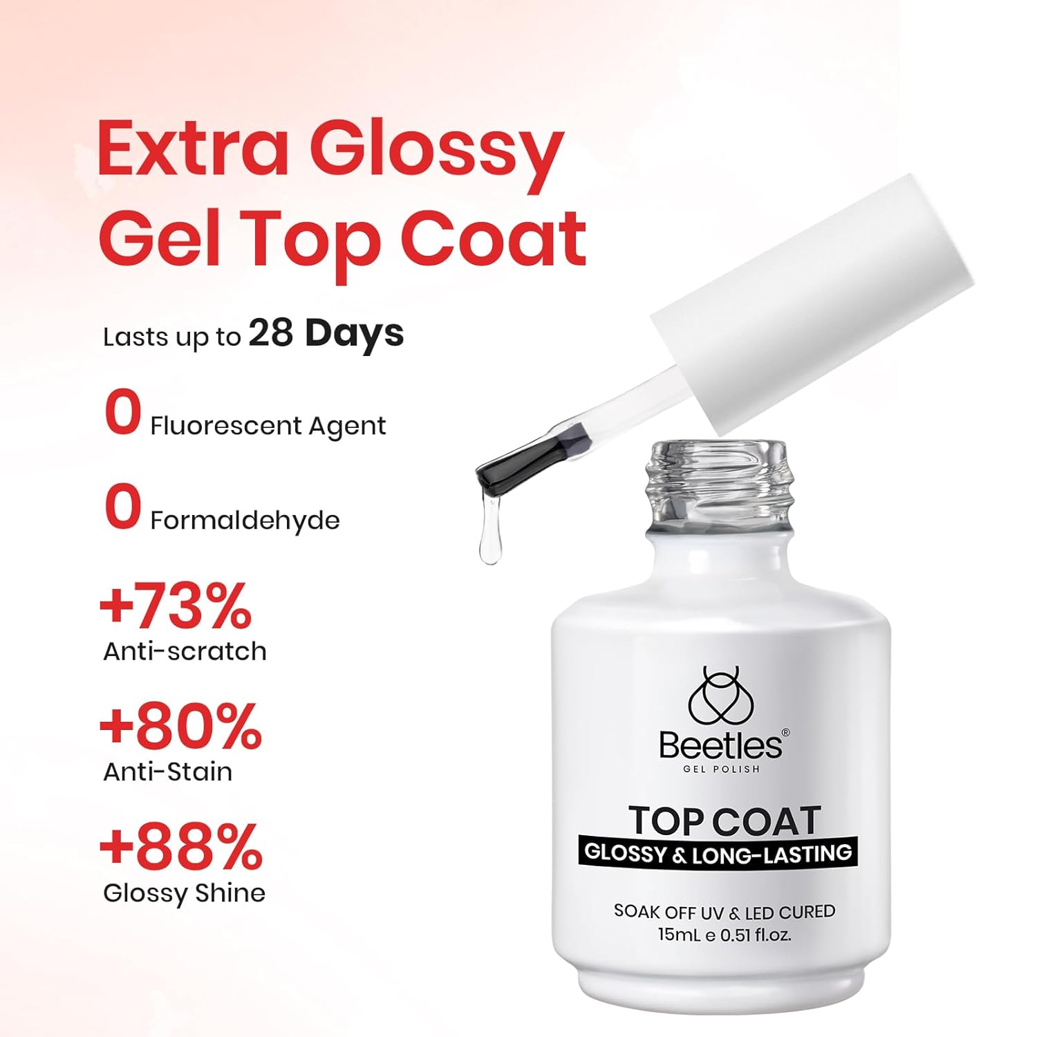 - Beetles Extra Glossy Top Coat : Upgraded top coat helps protect the nail surface, preventing gel nails from peeling, providing long-lasting abrasion resistance, preventing scratches, chips, and other damage, and preventing stains. Tips: Avoid touching your nails after curing the top coat for 2 minutes to enhance the shine.