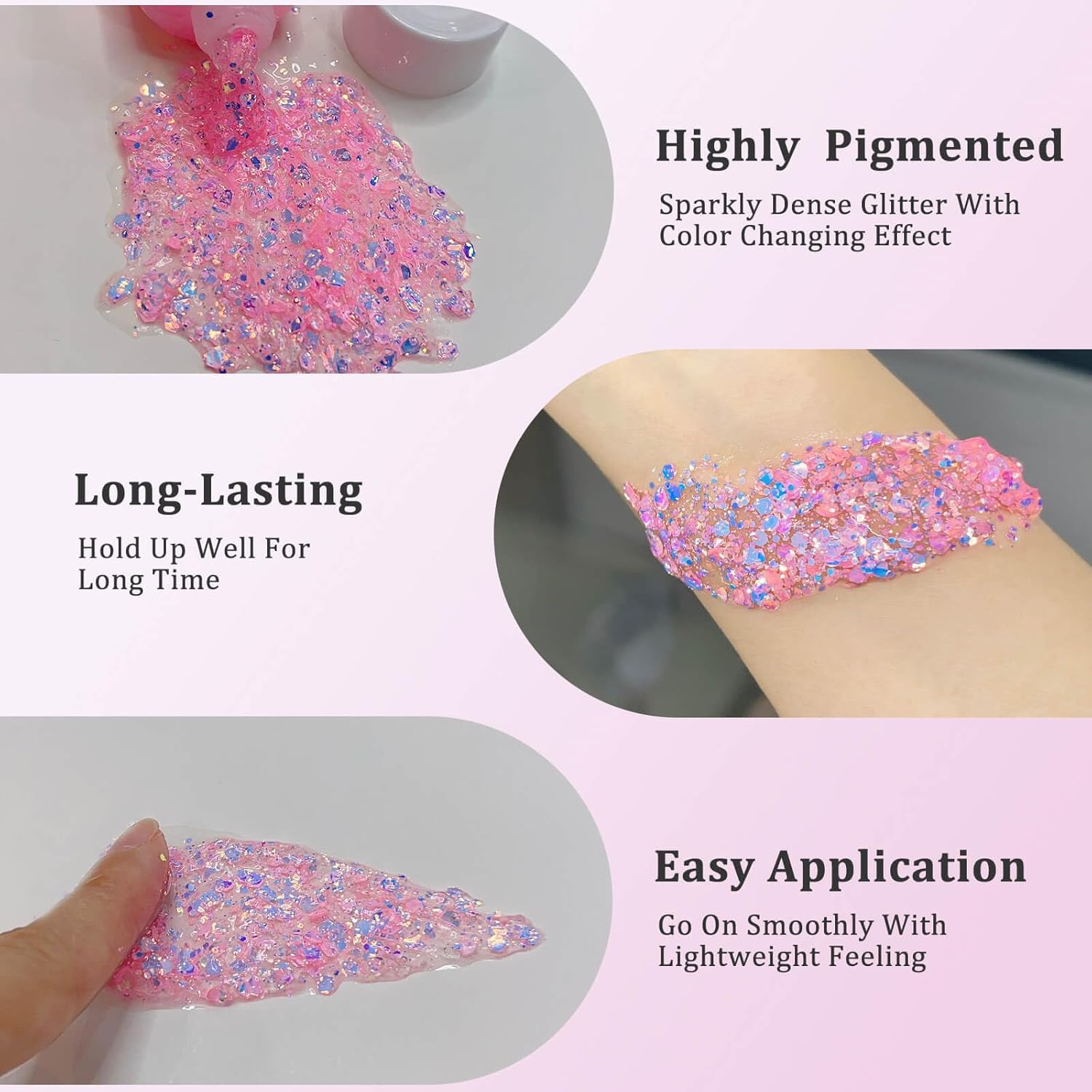 - Easy to Apply and Long Lasting:MEICOLY chameleon face glitter gel sticks to the skin very easily,it goes on smooth and dries quickly without becoming flakey,stays on well and hold up all day with bright and shiny effect