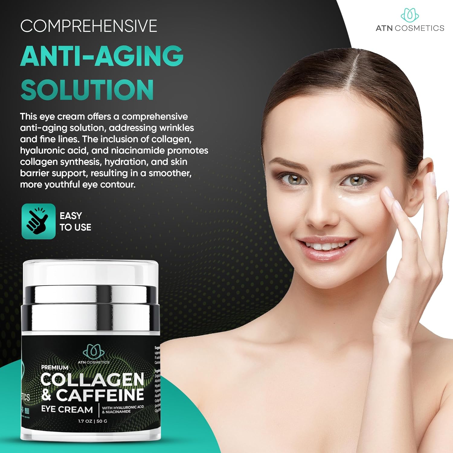 - Targeted Dark Circle and Puffiness Reduction: ATN Cosmetics Collagen & Caffeine Eye Cream is specially formulated to effectively target and reduce dark circles and puffiness around the eyes. The infusion of caffeine helps improve circulation, while collagen works to enhance skin elasticity, providing a brighter and revitalized appearance.