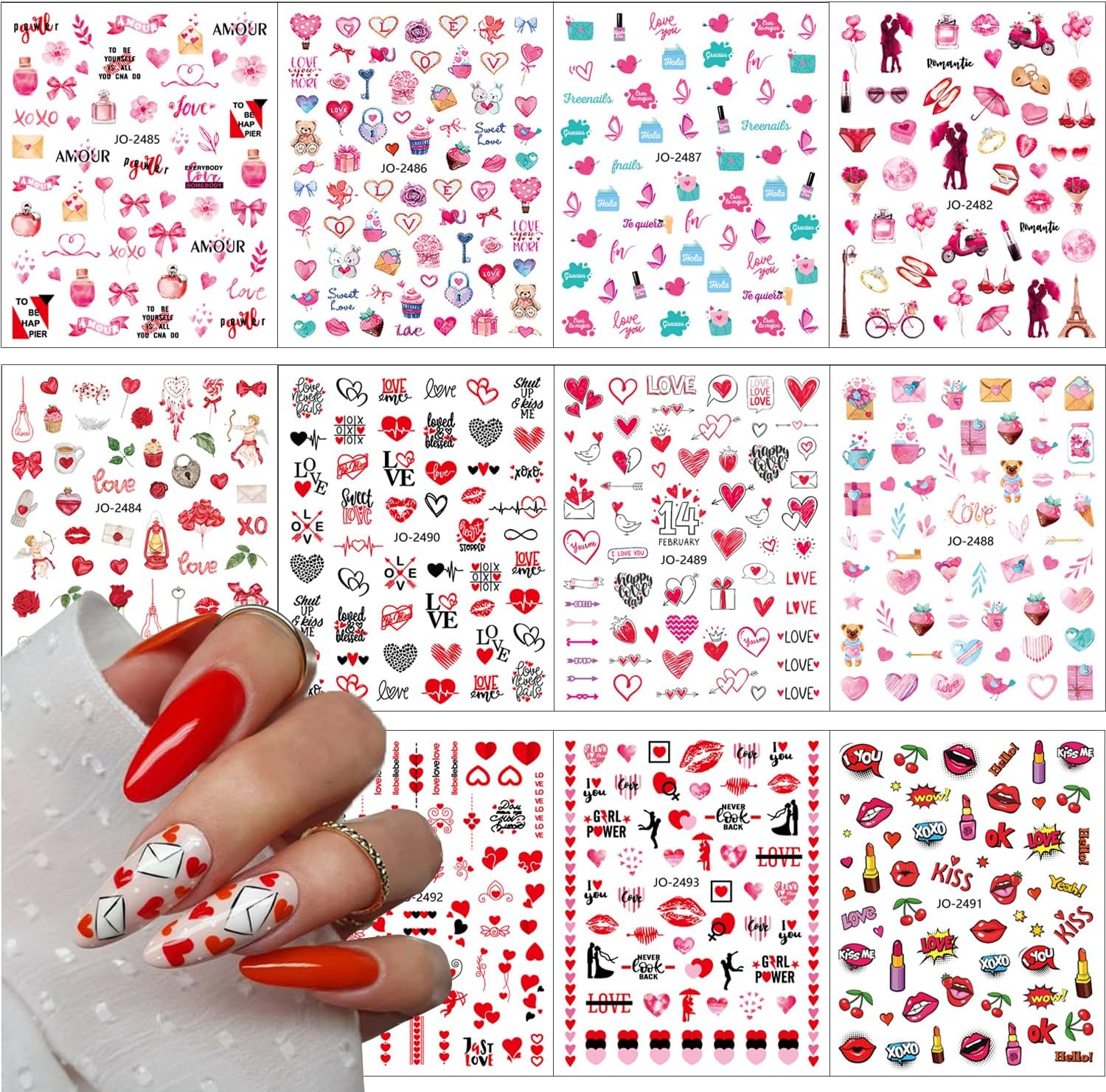 - ăValentines Stickers Package SetăYou will get 12 sheets heart nail art stickers, various patterns nail designs decoration.Self-Adhesive Valentines day nail decals provides you with a variety of options to give full play to your rich imagination of nail DIY.