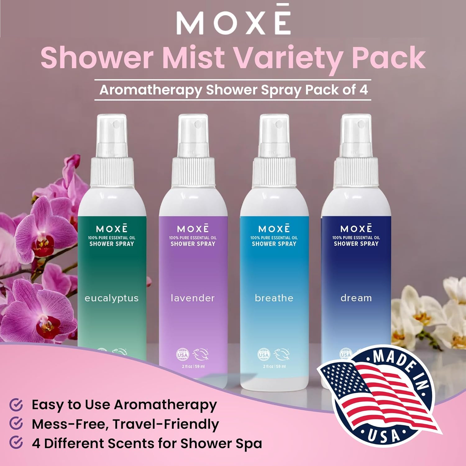 MOXE Aromatherapy Shower Mist Variety Pack, Eucalyptus, Lavender, Breathe and Dream, Spa Steam Spray, Natural 100% Essential Oils, Made in USA, Aromatherapy, Sinus Congestion Relief, 4 Pack (8oz)