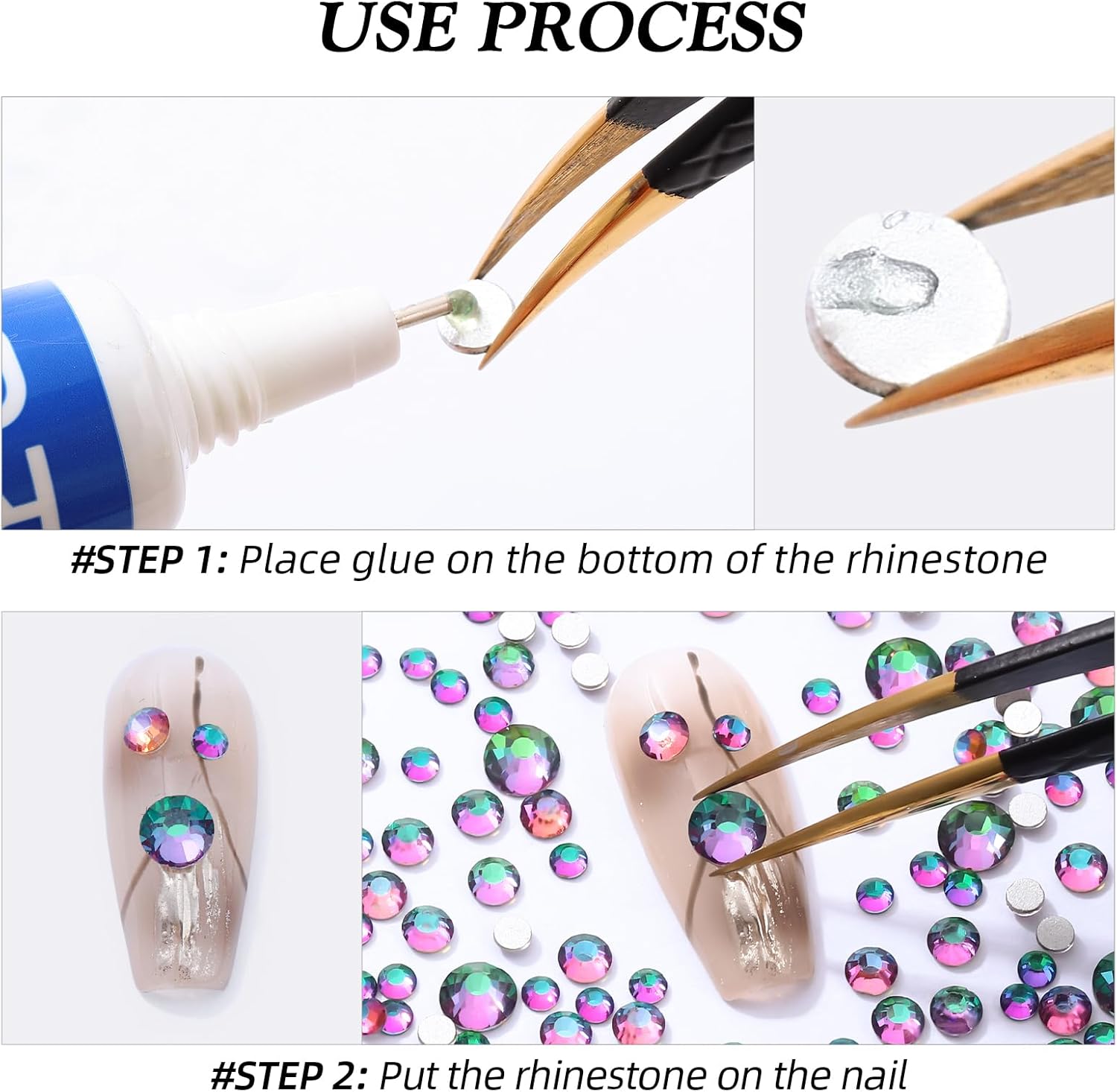 - Use tweezers and Picking Pen gem picker to pick rhinestones, There is no glue on the bottom, additional nail gel is required, or other professional glue for makeup or nails; Can use E6000/E7000 super glue to fix on crafts, art decoration; not hotfix