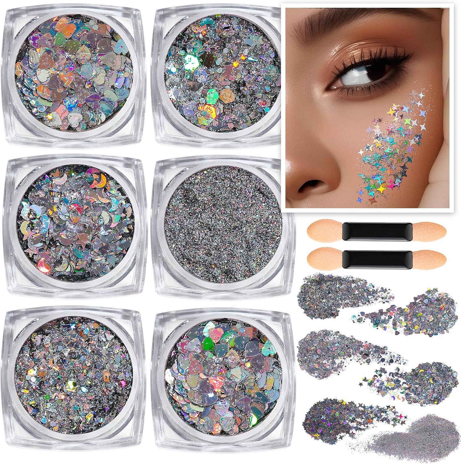 - SPARKLY BODY GLITTER GEL: Teenitor silver holographic body glitter set is absolutely stunning. The variety of shapes – stars and moons, starbursts, hearts – along with the different sizes of glitter offer endless possibilities for creating unique and dazzling looks. These came nicely packaged, sealed, and with multiple applicators