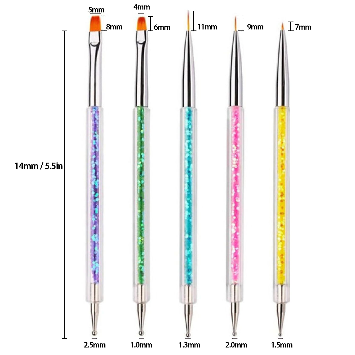 - 【Double-Ended Nail Kit】The nail brush includes 5pcs french nail art tools, one side is 3pcs nail art liner brushes in five different lengths - 7mm, 9mm, 11mm and 2pcs nail flat brushes. The other side is 5pcs dotting tools with a small ball for various size dotting, make your own nail art styles.