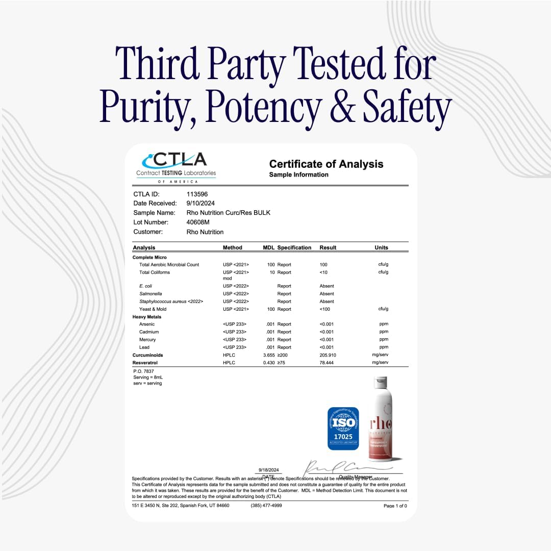 - CONVENIENT LIQUID FORM: Formulated in a liquid form with a fresh mango-orange flavor, Rho Nutrition Liposomal Curcumin + Resveratrol is vegan, sugar free, Keto, non-GMO, gluten, dairy & soy-free. This natural formulation is made with 98% Curcuminoids from Turmeric root extract and Trans-Resveratrol from Japanese Knotweed. Contains no added sugar, fillers, binders, or artificial coloring. Manufactured in the USA in a cGMP facility and third-party tested.