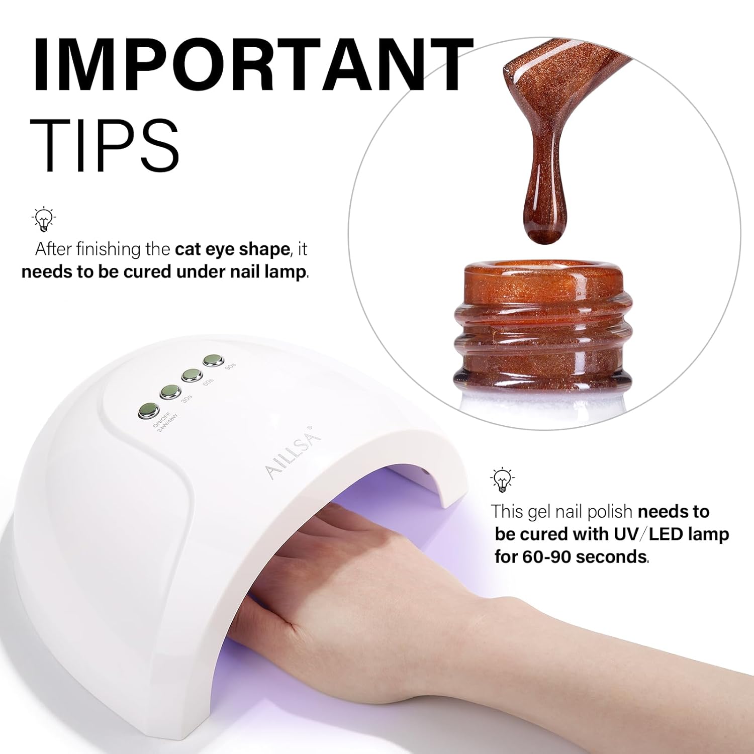 - CRYSTAL SPARKLING EFFECT - AILLSA Cat Eye Gel Nail Polish has a dense magnetic powder that can be used alone for a mirror-shimmering, crystal-clear manicure or with any base color nail polish, jelly gel nail polish, and other nail polishes.