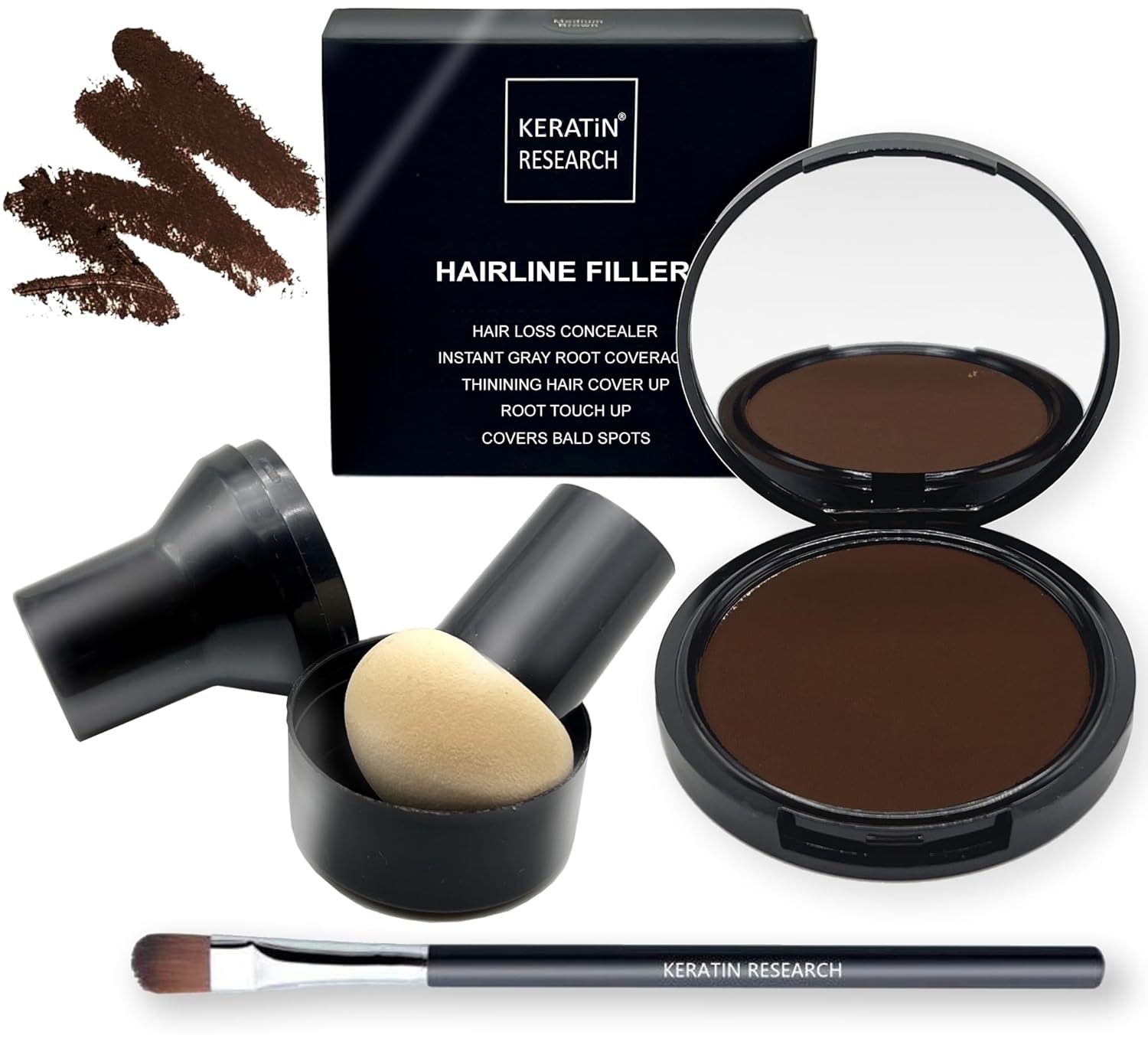 - Warm Medium Brown color. ROOT CONCEALER- Keratin Research Hairline Filler, a Premium Root Cover Up, is your secret weapon for at home or on-the-go. Camouflage roots and grays instantly, giving you full great looking hair! The Cover Up Powder also conceals thinning hair and hair loss, for an instant look of healthy volume. Packaging includes a large mirror and a great mushroom applicator. Root touch up powder is resistant to rain, sweat, and wind.