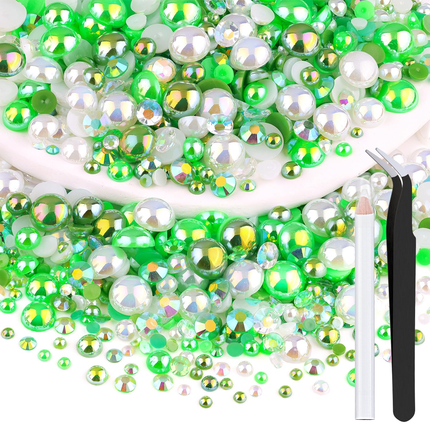 80g Flatback Pearls and Rhinestones for Crafting, Green Mixed Size 3-10mm Resin Rhinestones and Half Pearls for Bedazzling, Nail Art and Decoration with Tweezer and Pickup Pencil