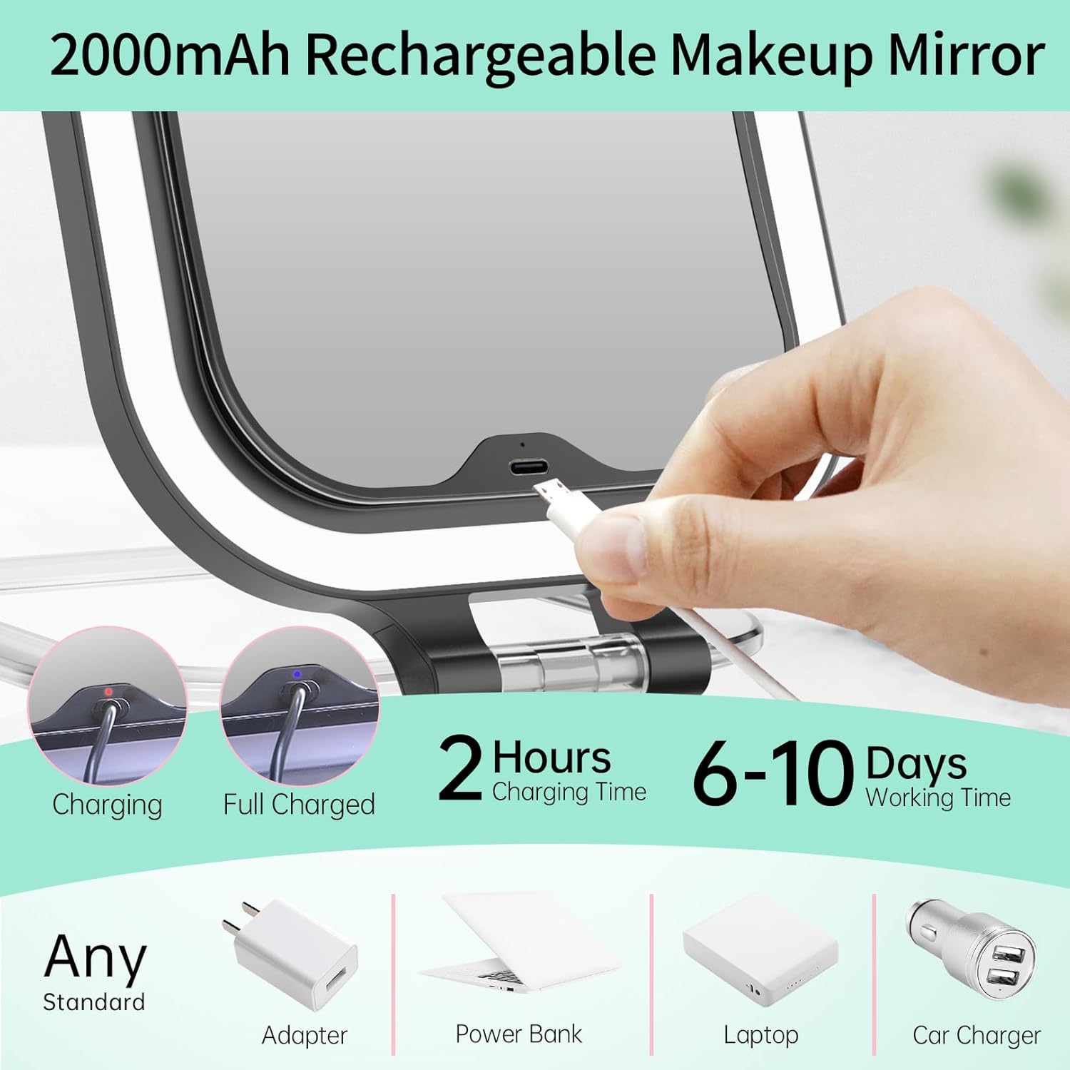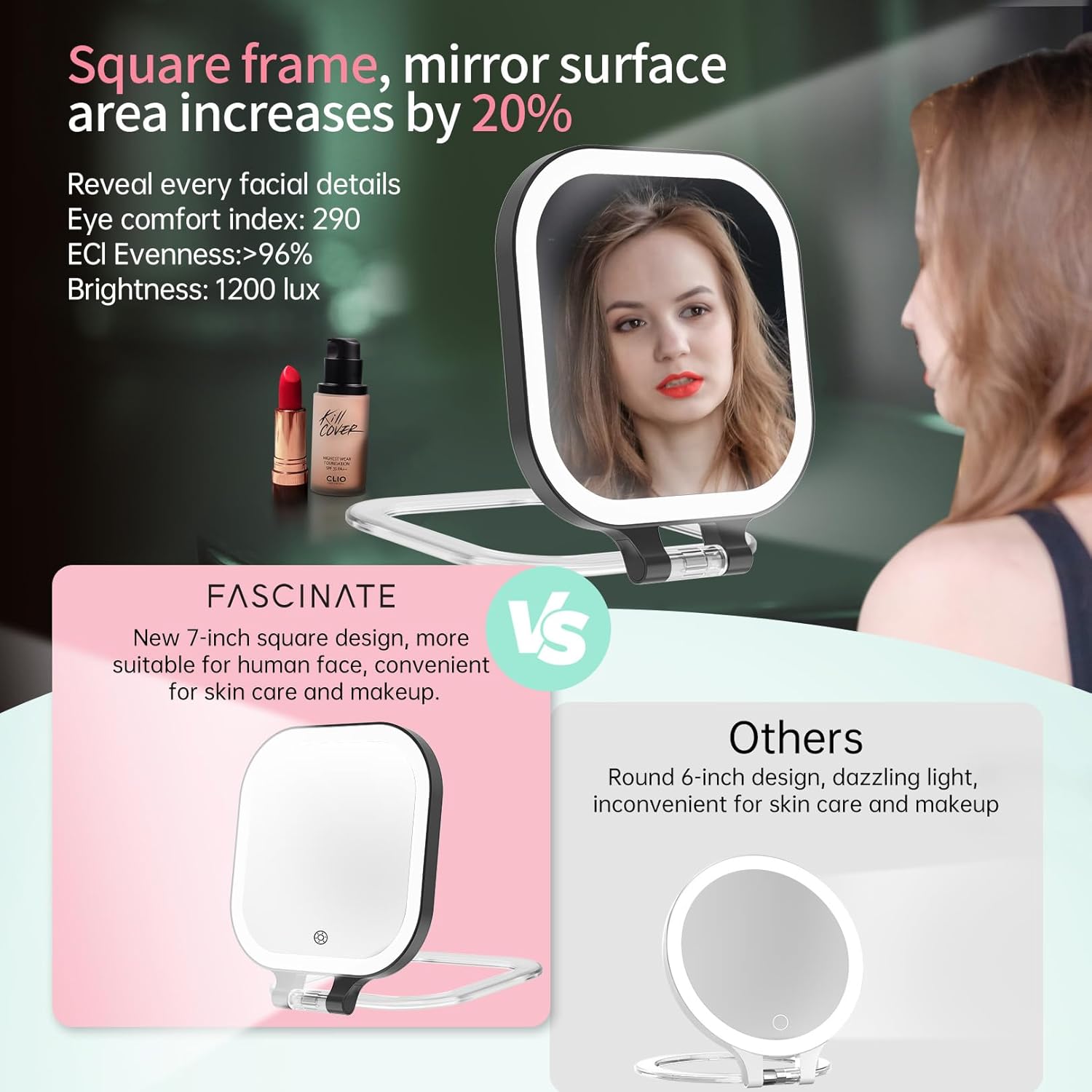 - đăFASCINATE 2025 Upgraded Travel Makeup Mirroră In response to customer requests for a more travel-friendly magnifying makeup mirror, we have upgraded the 2000mAh rechargeable lithium battery. The travel mirror with light can be used for 6-10 days when fully charged. The travel mirror size is: 8.1 * 7.1 * 0.98 inch, weights only 0.9 lb, which is enough to meet your makeup and touch-up needs for daily commuting and 2-3 days of business or travel.