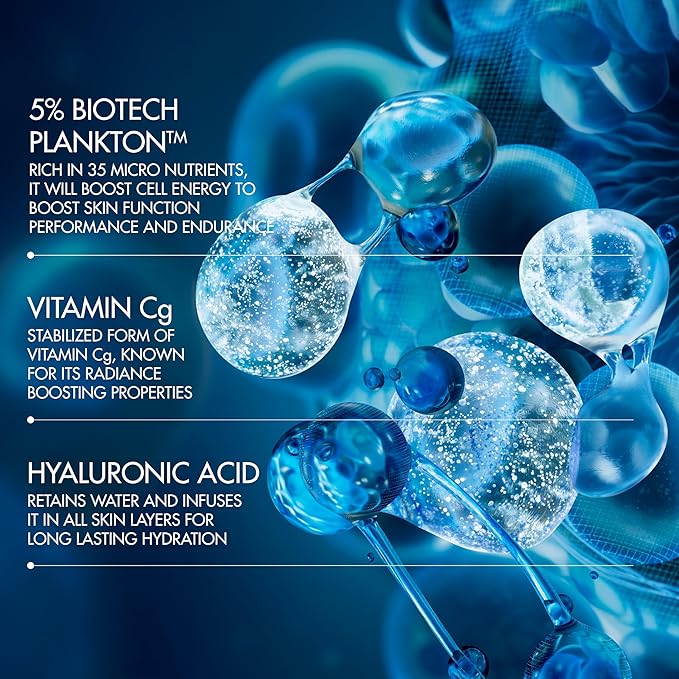- Powered by 5% Biotech Plankton to reduce wrinkles and boost elasticity, Vitamin Cg contributing to smoother and more even skin and Hyaluronic Acid for long lasting skin hydration.