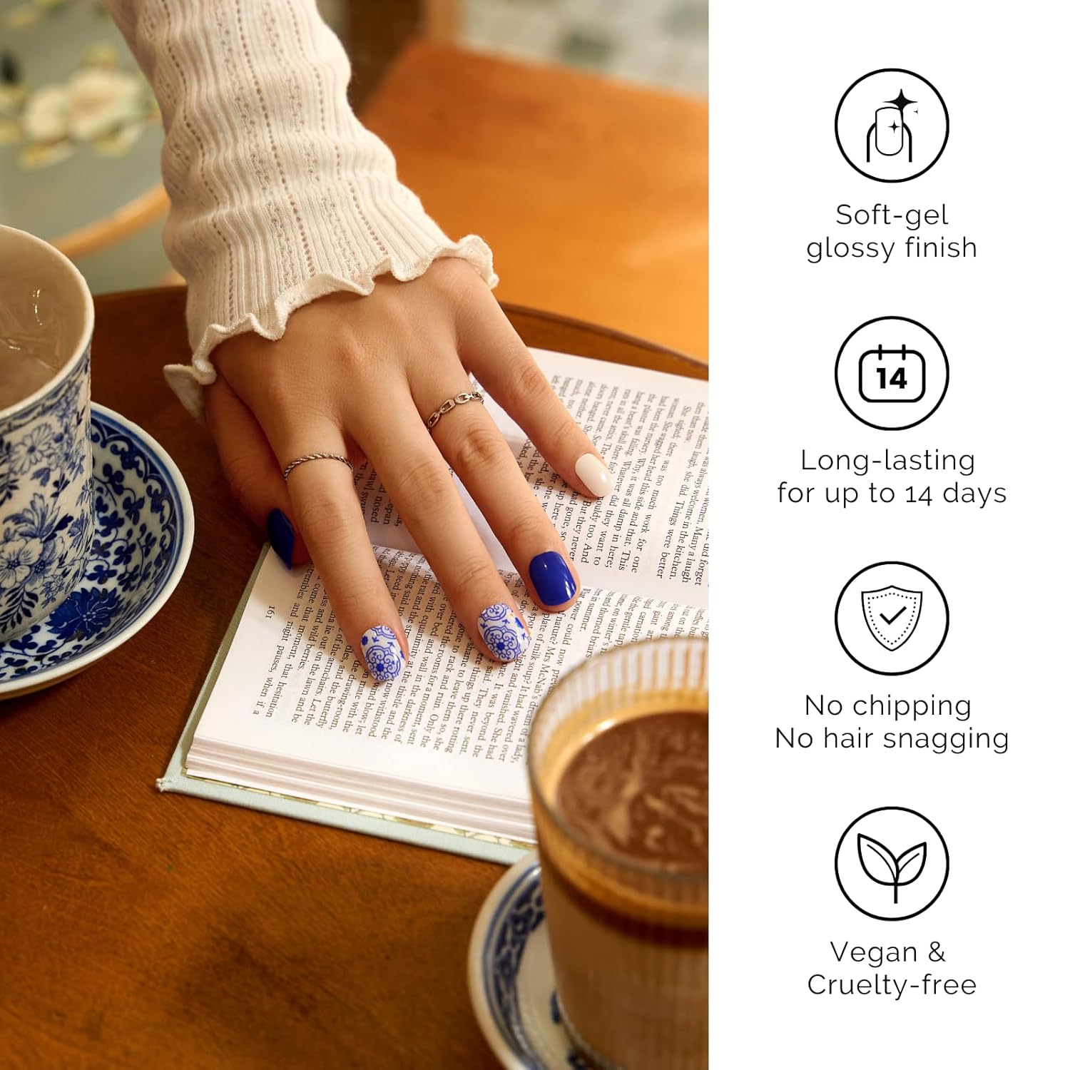 NAILOG Semi Cured Gel Strips - 34 Pcs Nail Stickers Buy 2 Get 1 UV Light | Long Lasting Wraps With Glossy Gel Finish Blue, Cerulean Porcelain