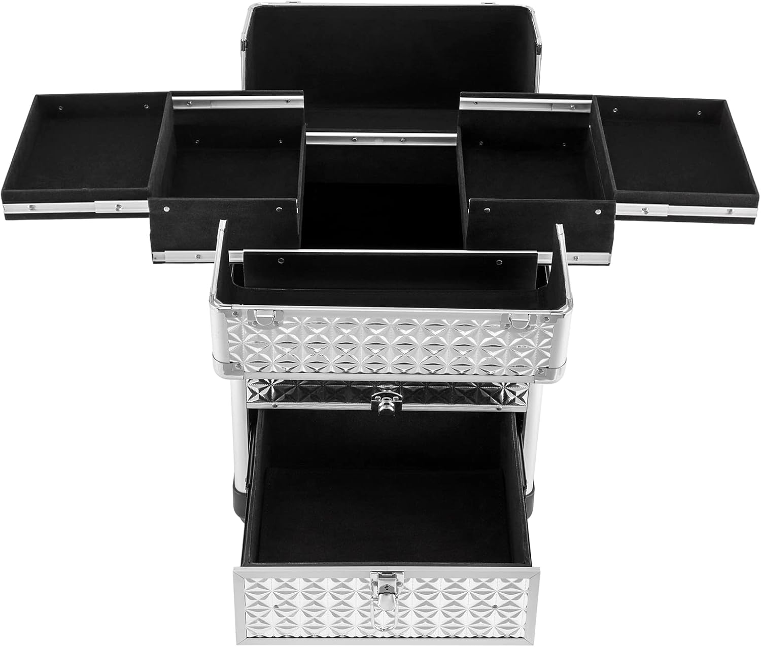 Rolling Makeup Train Case Professional Cosmetic Organizer Large Capacity Trolley Makeup Travel Case with 360° Swivel Wheels for Makeup Artist (Silver)