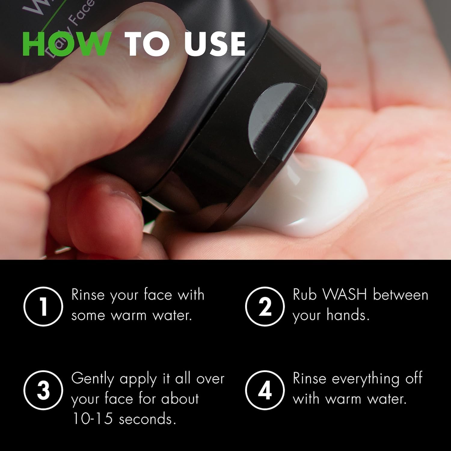 - How to Use: First, rinse your face with some warm water. Then squeeze a nickel-size amount of WASH onto your fingers. Briefly rub your hands together to spread it out, then gently apply it all over your face for 10-15 seconds, avoiding your eyes and mouth. After cleansing, rinse off with more water. Use once in the morning and at night.