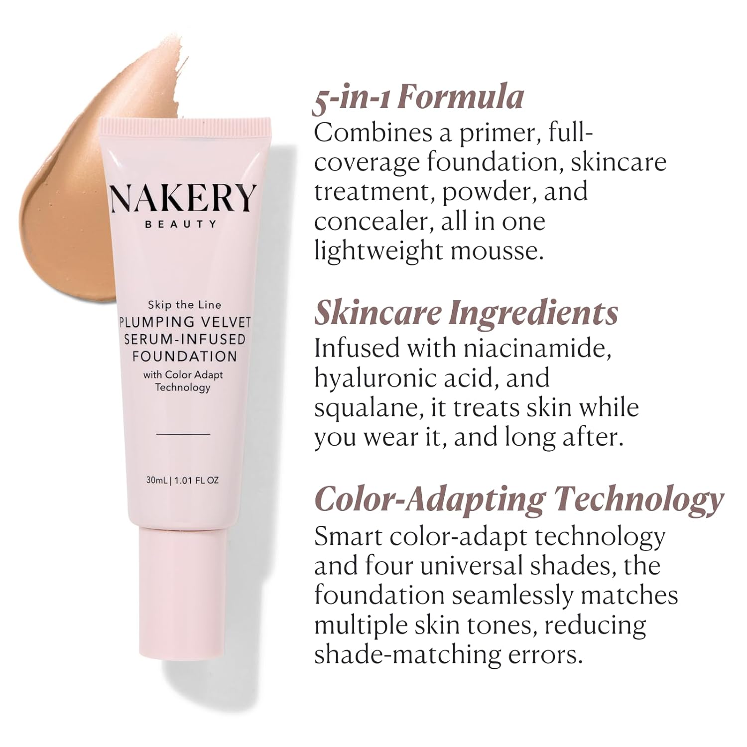 Nakery Full Coverage Foundation for Women - 5 in 1 Plumping Liquid Foundation Makeup - Serum Infused Makeup Foundation Smart Color Adapt with Niacinamide & Hyaluronic Acid for All Skin Types - Light