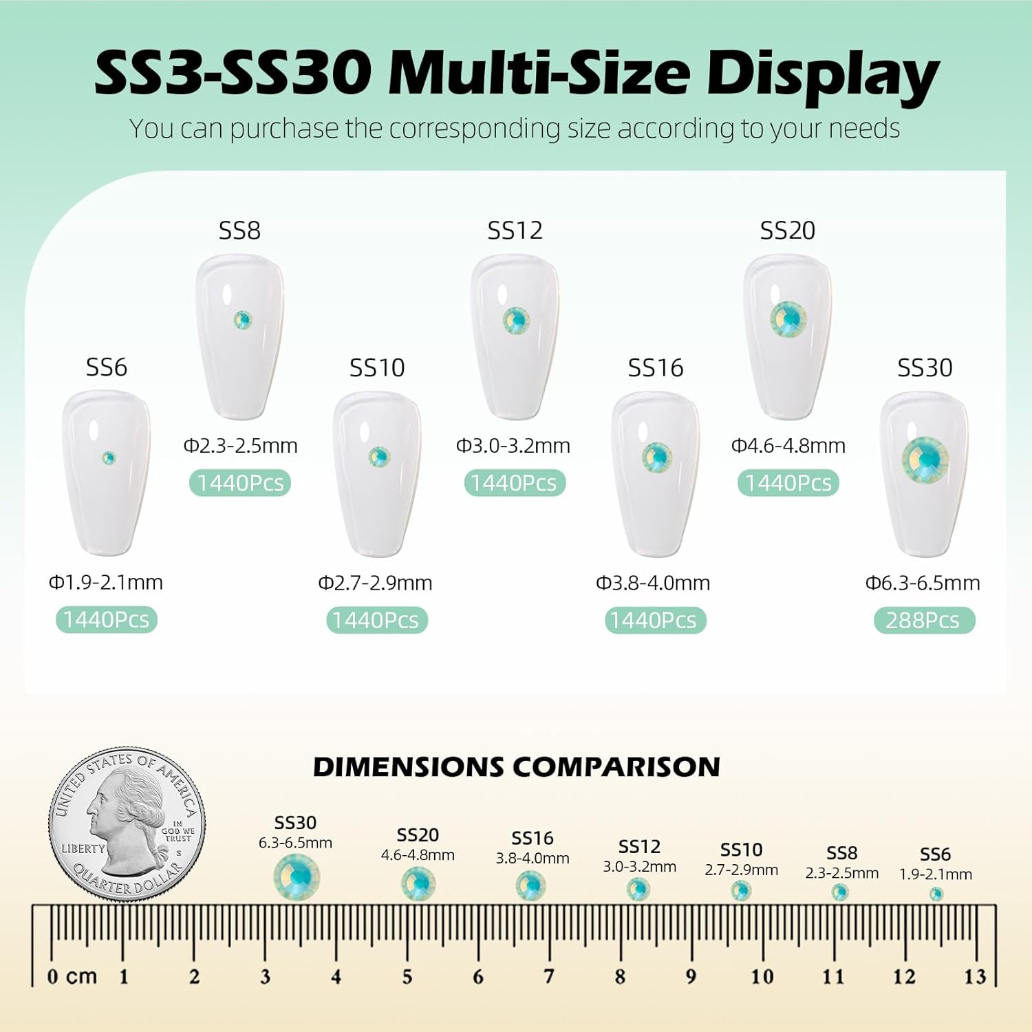 - Product Packaging: Bags packaging SS6 1.9~2.0 MM - 1440 Pcs F Light green flatback rhinestones