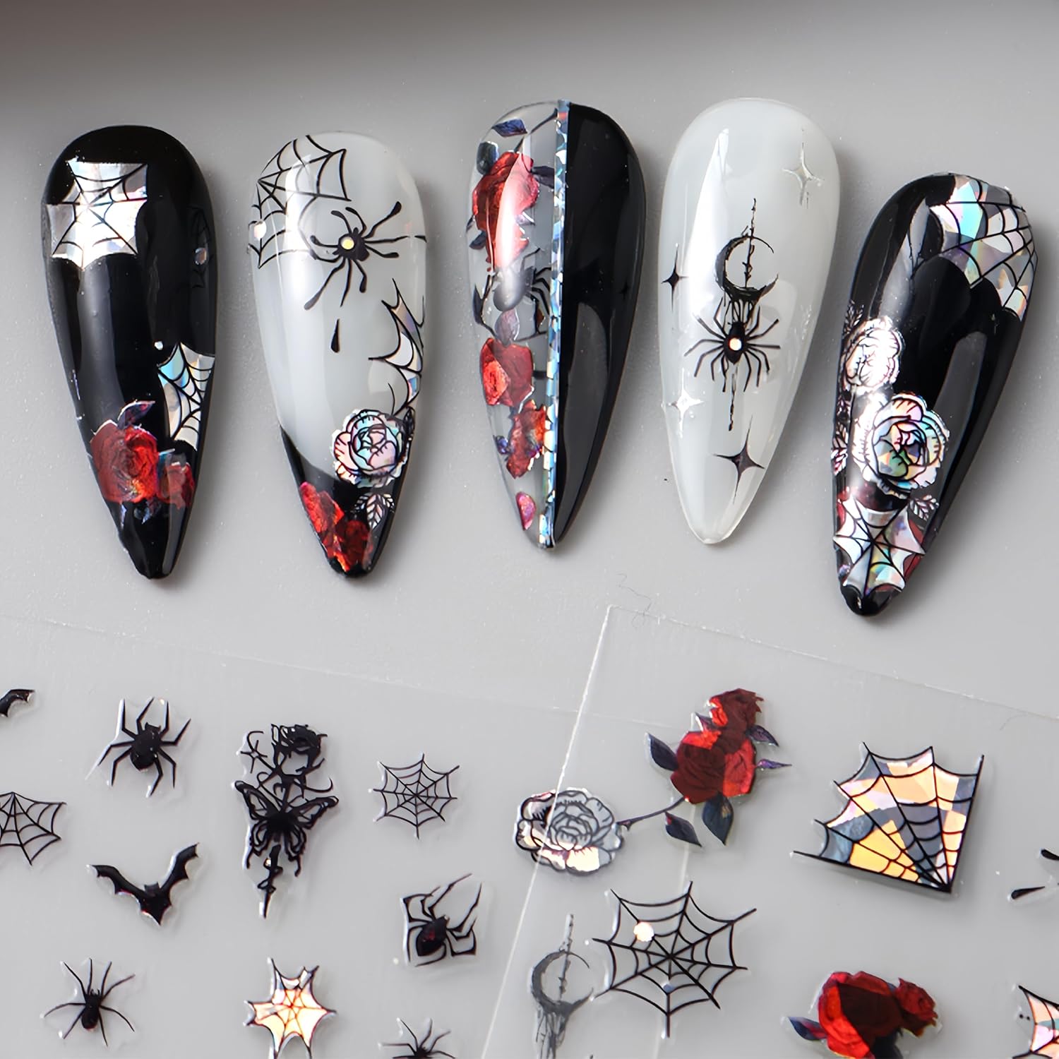 - Halloween Nail Stickers- You will get 6 sheets halloween glitter spider web nail art stickers for acrylic nails supply, many pattern for you to choose, colorful scorpion nail designs, and satisfy your rich imagination of nail DIY