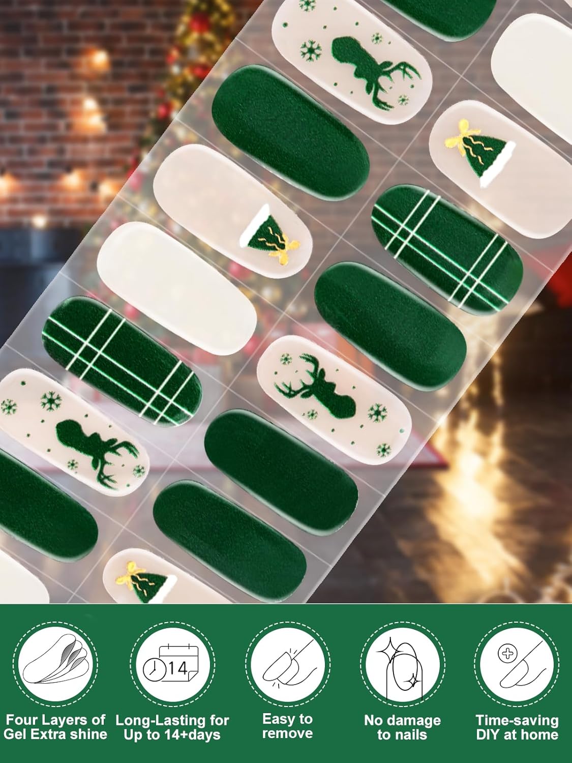 - [Christmas-themed nail wraps] -A unique green elk pattern adds a natural feel, cute animals, and forest themes..EBANKU Christmas gel nail strips are made by solidifying real gel nail polish with the cure technique. You could display a colorful, stylish, modern gel nail for happy Christmas Holidays!
