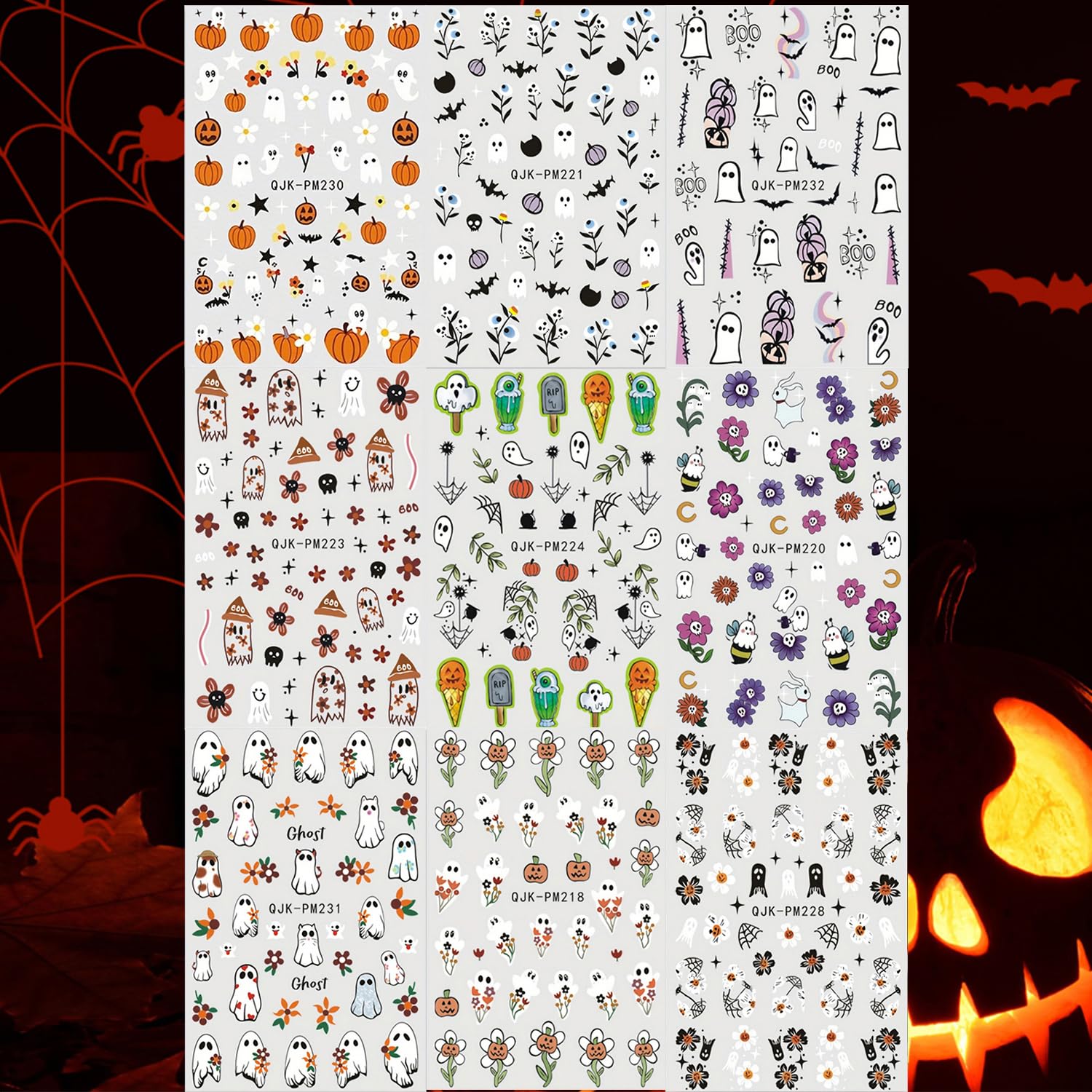 - Variety of Designs: The 9 sheets Halloween nail decals include a range of spooky designs such as cute ghosts, pumpkins, flowers, and spider. Achieve a different look every time with these diverse options