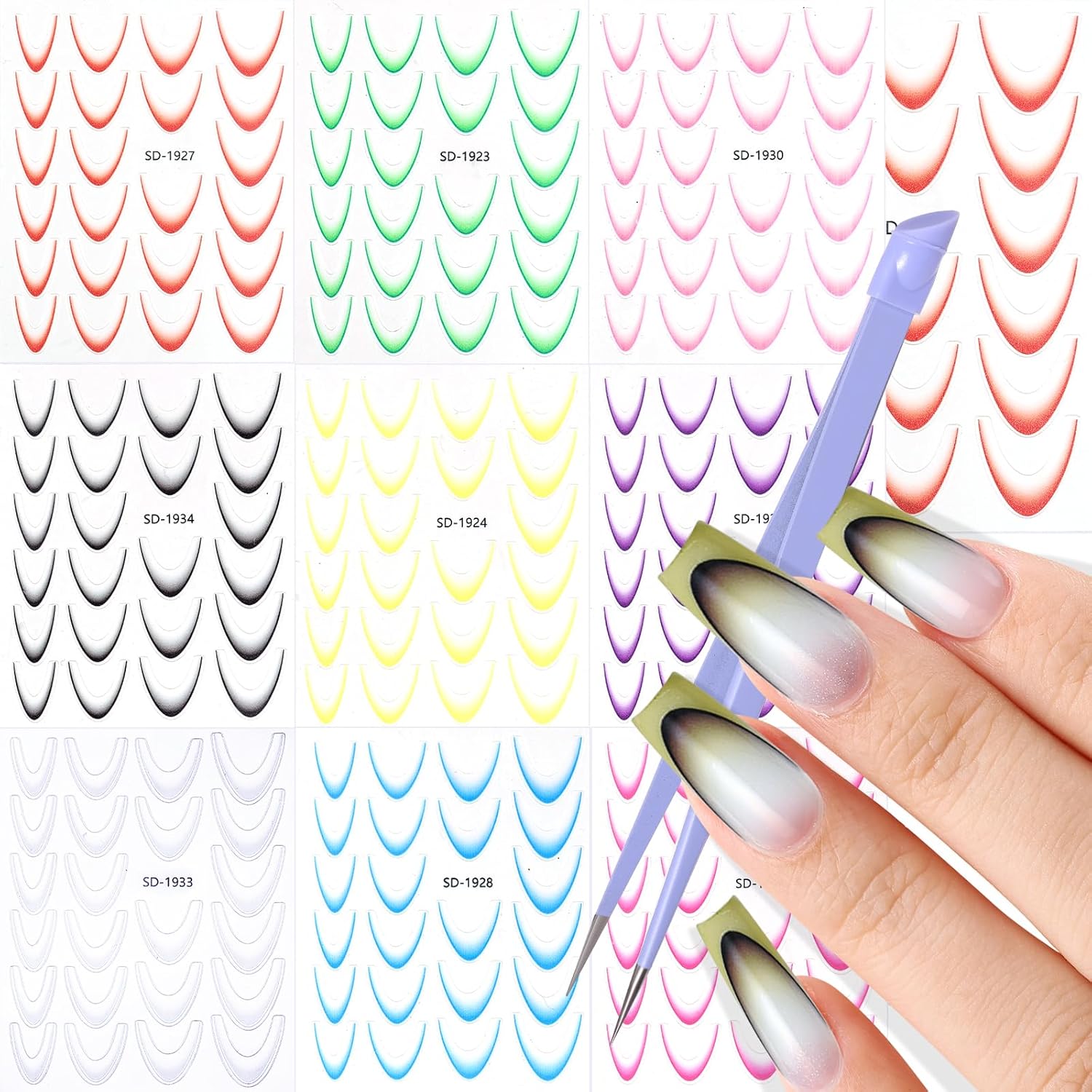 - 【3D Gradient French Tip Stickers】You will receive 9 sheets 3D French nail stickers in different colors, each with French line patterns of different sizes. Gradient French nail stickers and decal stripe designs combine popular elements, with simple design and rich colors, enough to satisfy your various French nail designs.