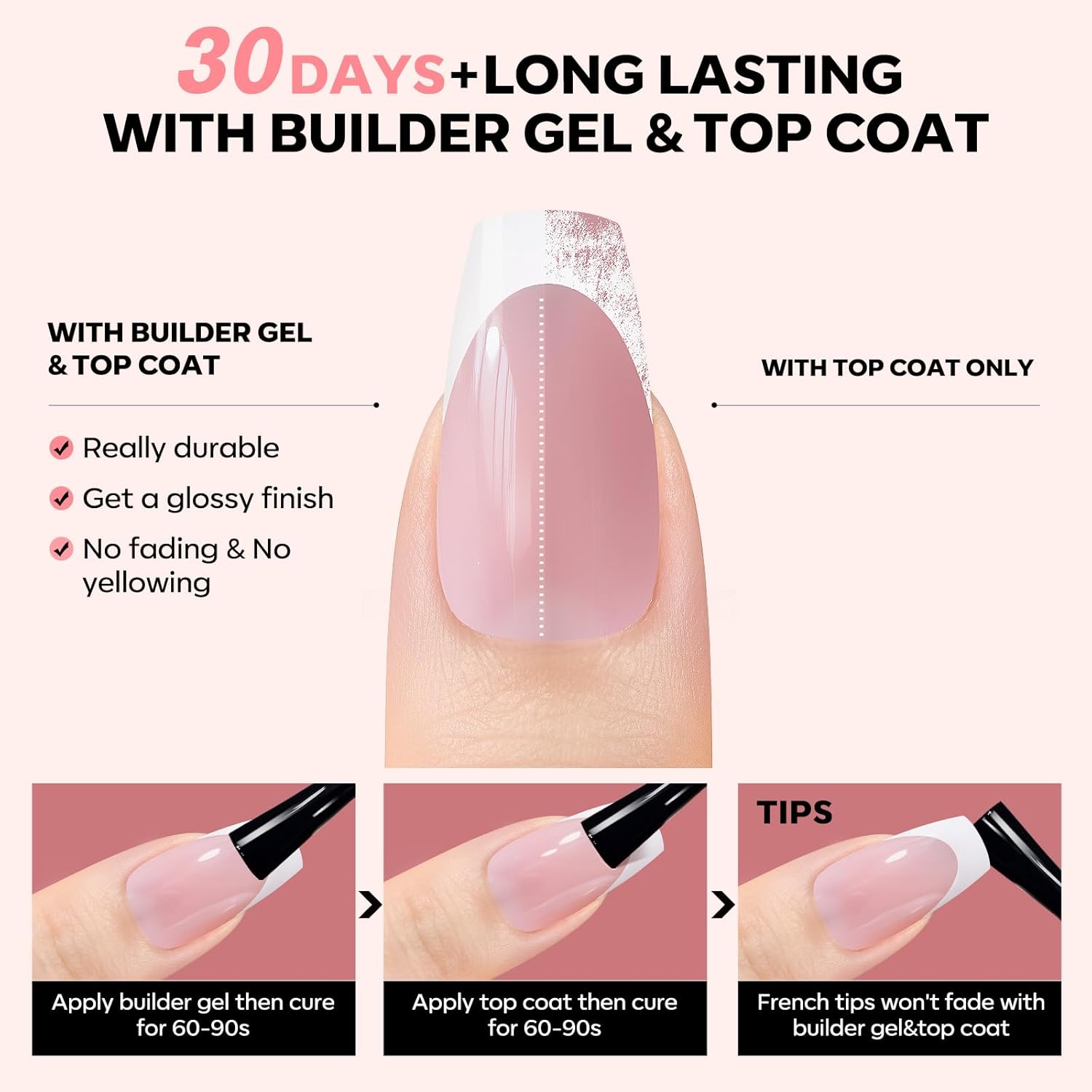 - Time & Money Saver: No base coat needed, just apply glue, complete with builder gel and top coat for professional-grade durability. Easily get salon-quality french press on nails in under 15 minutes and cheaper than salon nails, time and money saving.