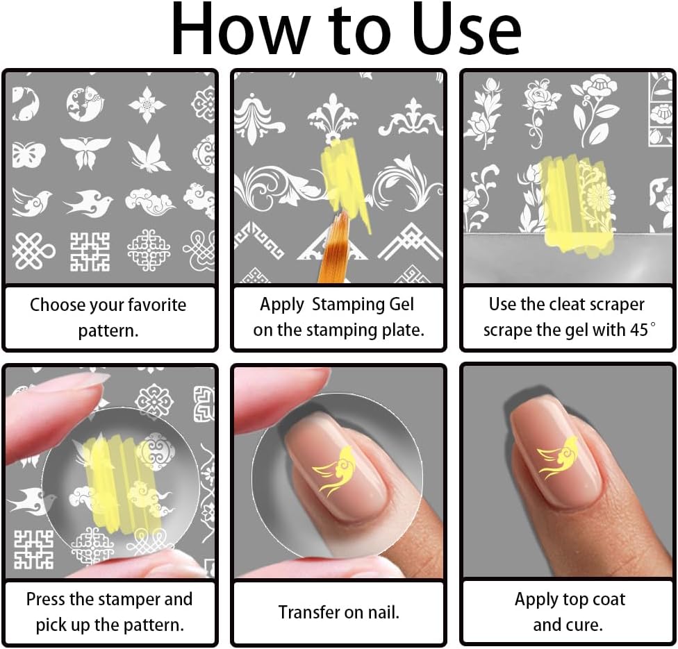 - Easy to Use: 1. Apply paint adhesive to the stencil, then use a scraper to quickly scrape off the excess 2.Use a silicone stamper to press down on the transfer pattern 3. Quickly transfer the pattern onto your nails 4.Bake dry to apply sealer then shine the lamp