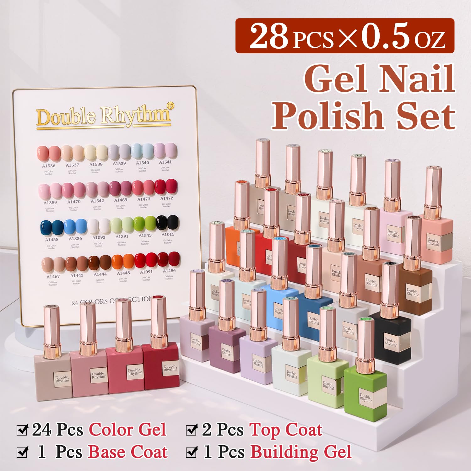 - 28Pcs Same Color Same Bottle Gel Polish: 24pcs 15ml gel polish for all season,2 pcs clear top gel and 1 pcs gel base gel and 1 pcs building gel, need to be cured under UV or LED Lamp for 60-120s. . Please shake the bottle or warm it with hot water before use, to acheive a better effect.