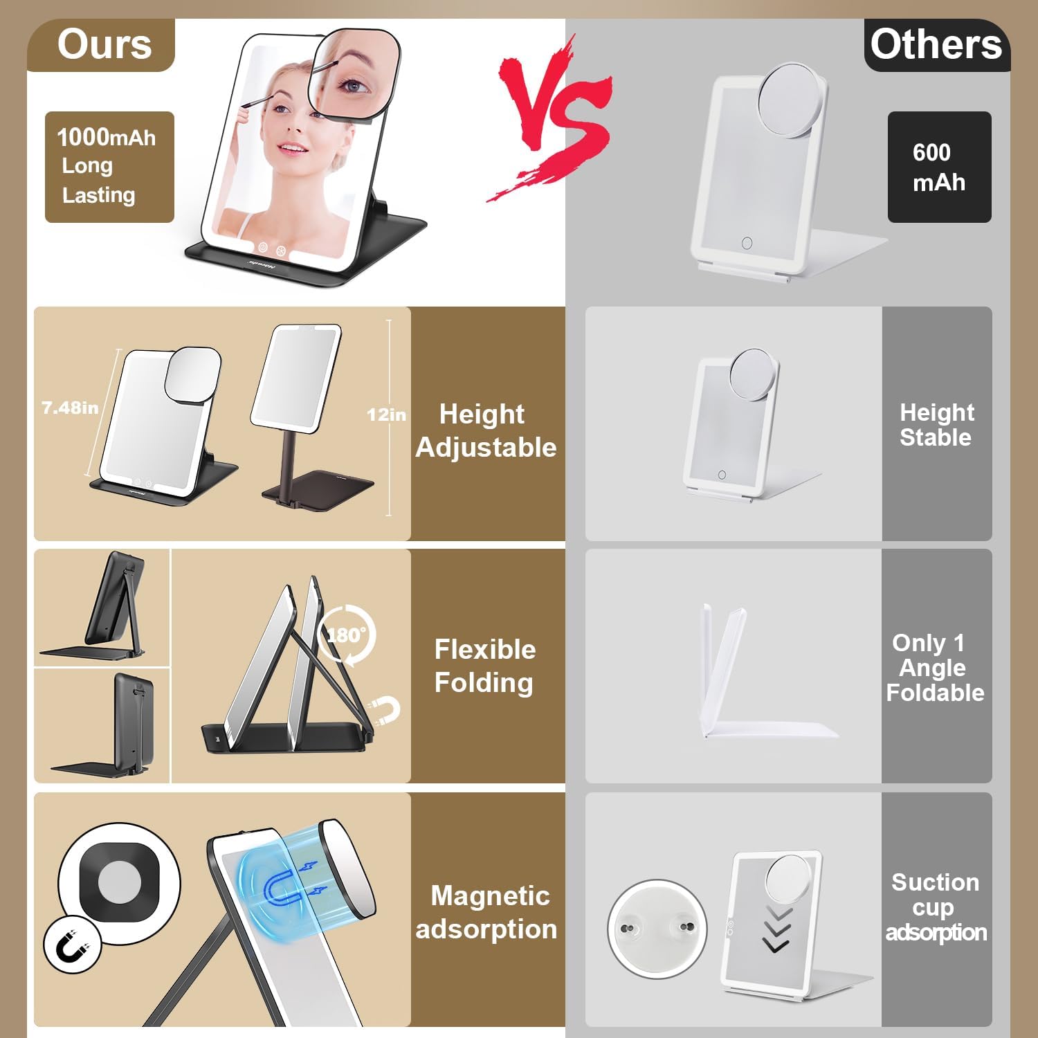 Mocado Travel Makeup Mirror with Light - 7x5 Inches Tripple Folding Travel Mirror with Light, 3 Colors Lighted Makeup Mirror, Portable Makeup Mirror, Freely Adjust Height and Angle(Black)
