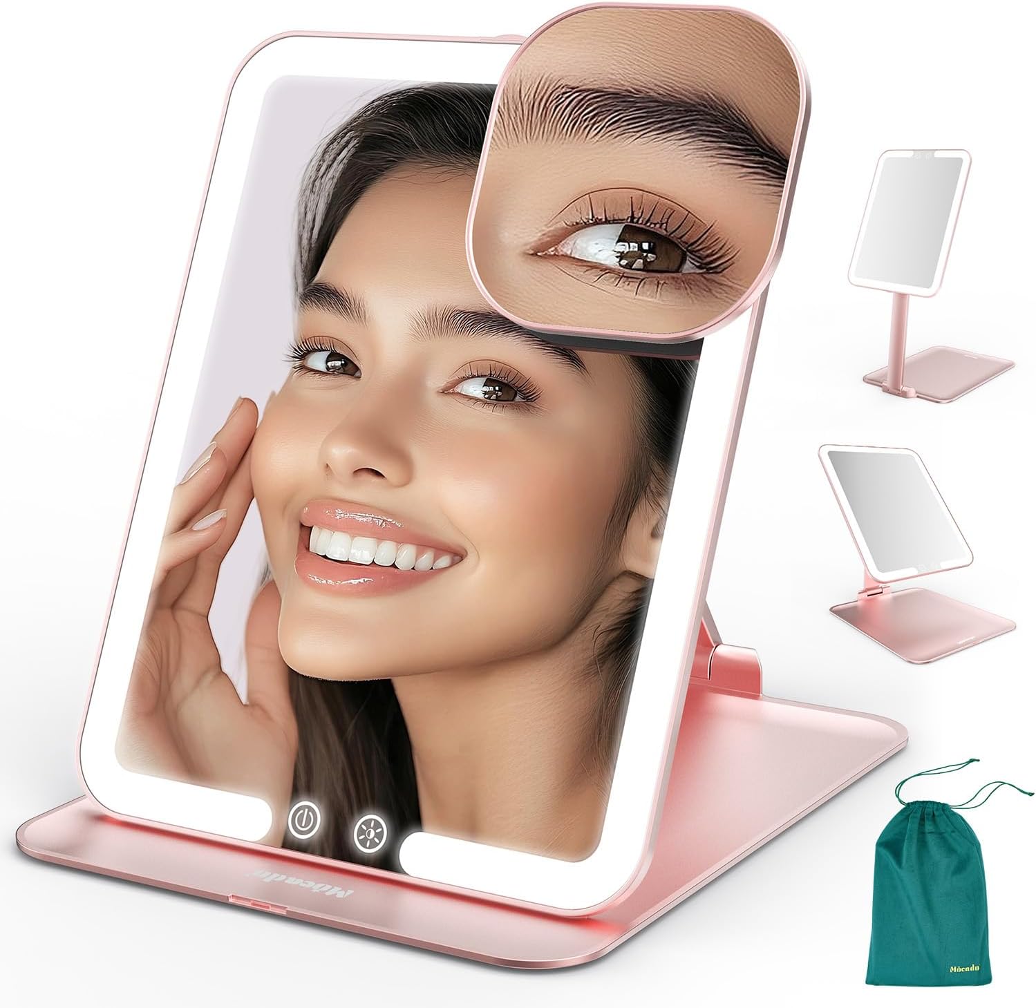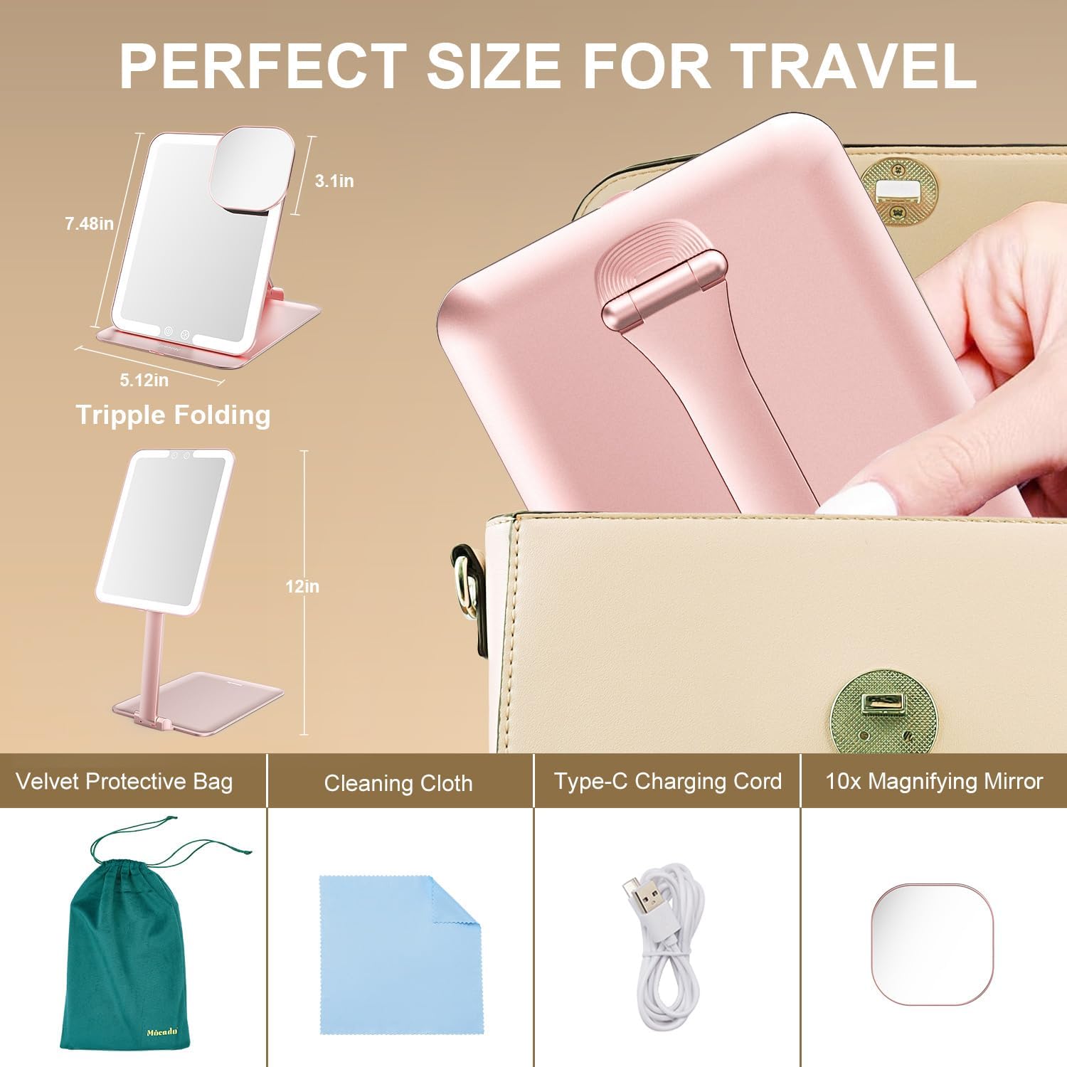 - âď¸ăPortable For CarryingăProfessional Travel Design Size: 8x6 Inches, only 0.6 Inch when folded, slim design, with velvet storage bag, easy to carry in handbag, backpack, luggage. Whether you are travelling, party or business trip, Mocado Travel Makeup Mirror is perfect for you.