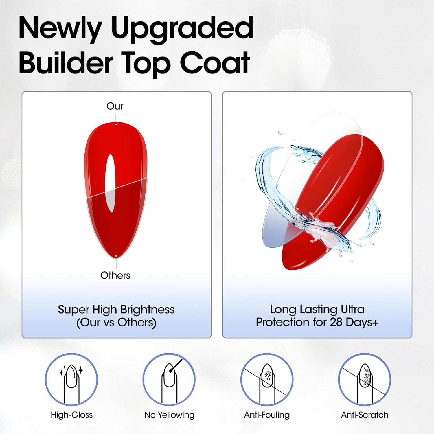 - Upgraded Healthy Ingredients: Our Builder Top Coat Gel is 11 toxin-free, cruelty-free & vegan and free of harsh chemicals. The formula is designed to prevent yellowing, whitening, and has a low odor for a more pleasant manicure experience. It also features self-leveling properties, ensuring a smooth and even finish every time.