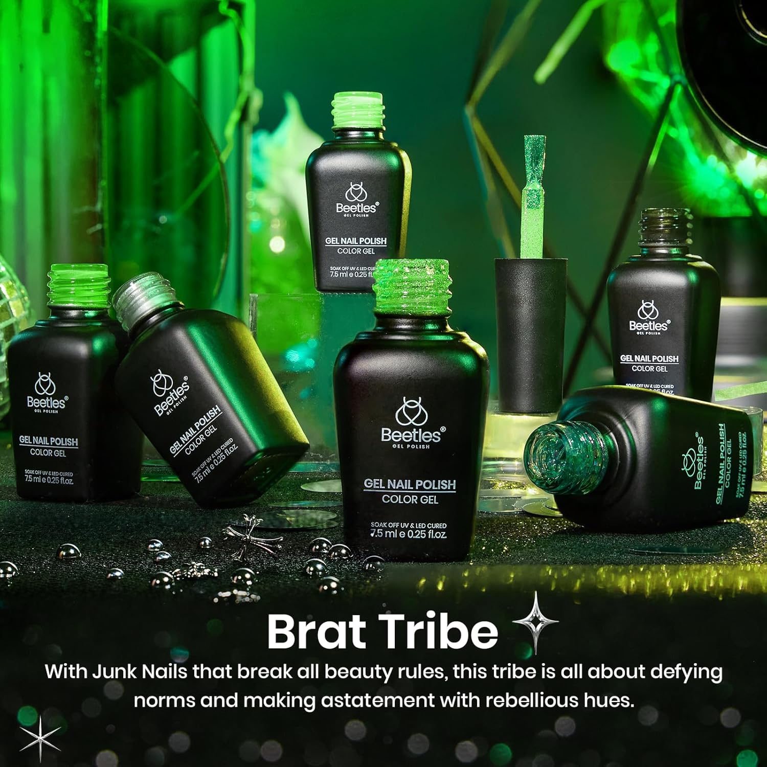 - Trendy Neon Green & Black Nail Polish: Beetles Brat Tribe Gel Polish Set includes 6 bold colors bright neon green, classic black, and shimmering silver glitter perfect for edgy, eye-catching nail designs.