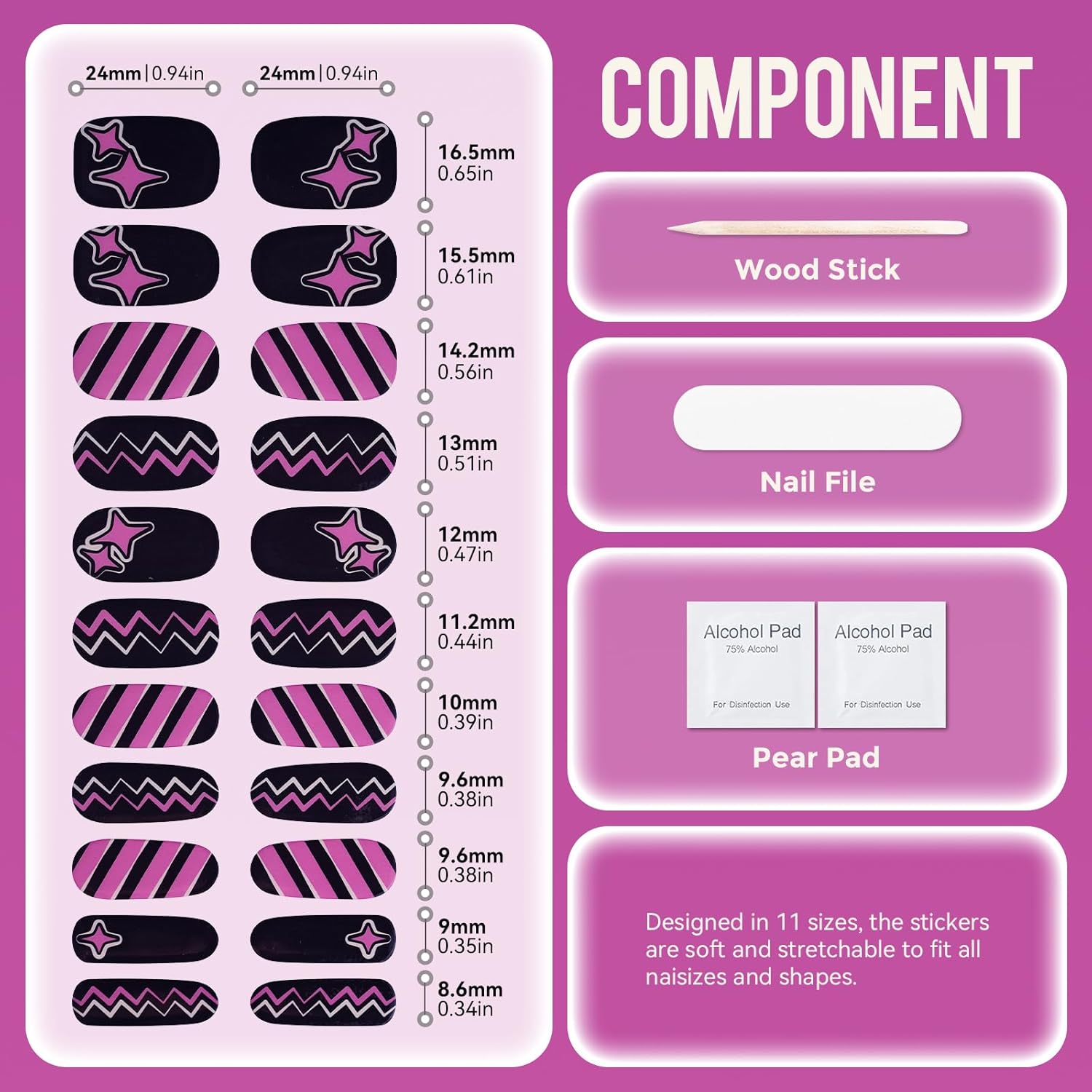 - 【Gel Nail Sticker Set】This no-bake gel nail sticker set includes 22 pcs of gel nail stickers in 11 distinct sizes, along with 2 preparation pads,a nail file,and a wooden stick