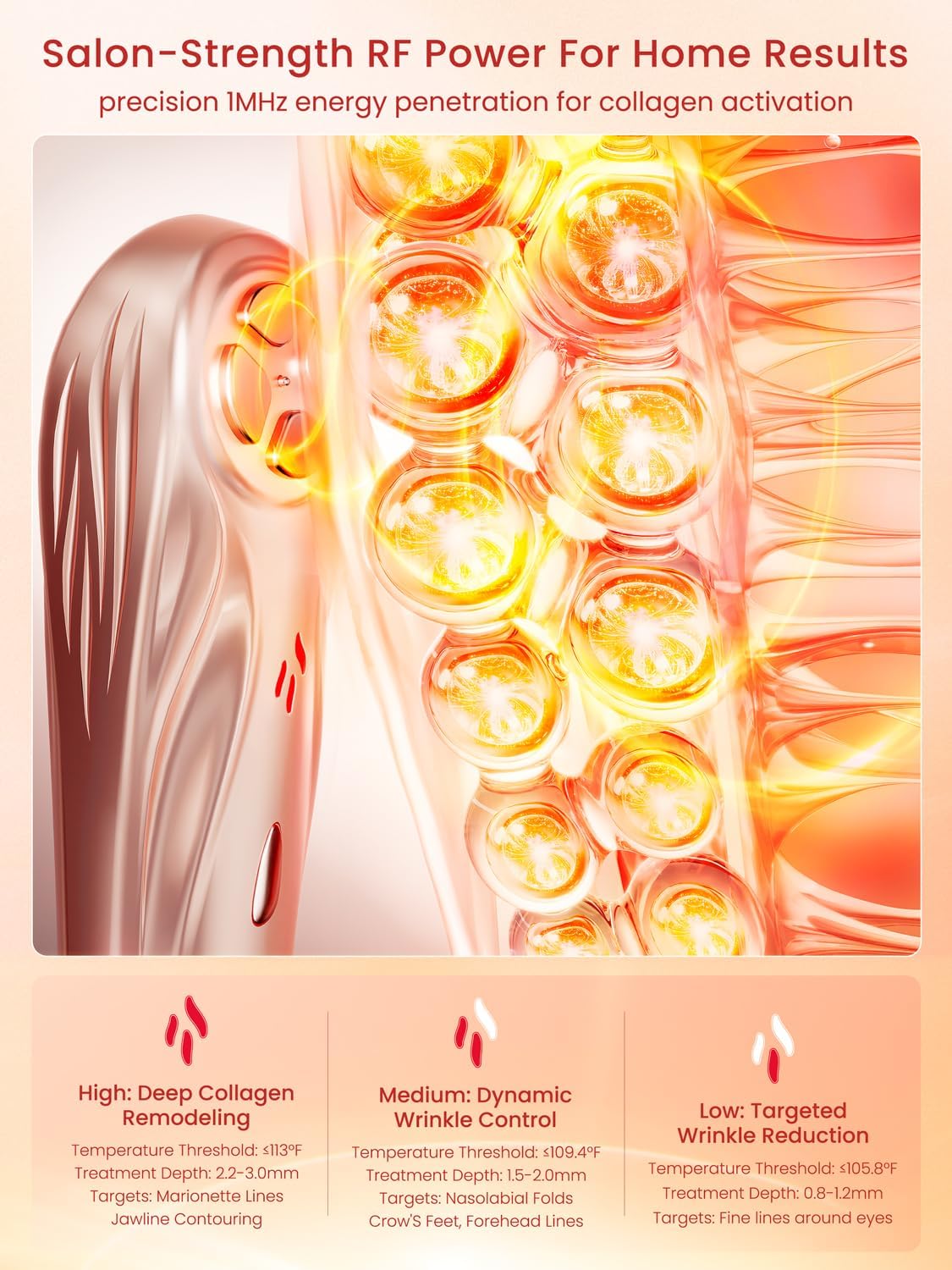 - 【Smooth Wrinkles, Firm Contours】3 Simple Settings for targeted concerns: Mild (Level 1): for delicate eye contour and sensitive skin; Rejuvenating (Level 2): improves smile lines and forehead lines; Intense (Level 3): firming jawline and cheek contours. For best results, use slow circular motions with light pressure to activate the RF energy. Ergonomic head glides smoothly along facial curves – no pulling or discomfort