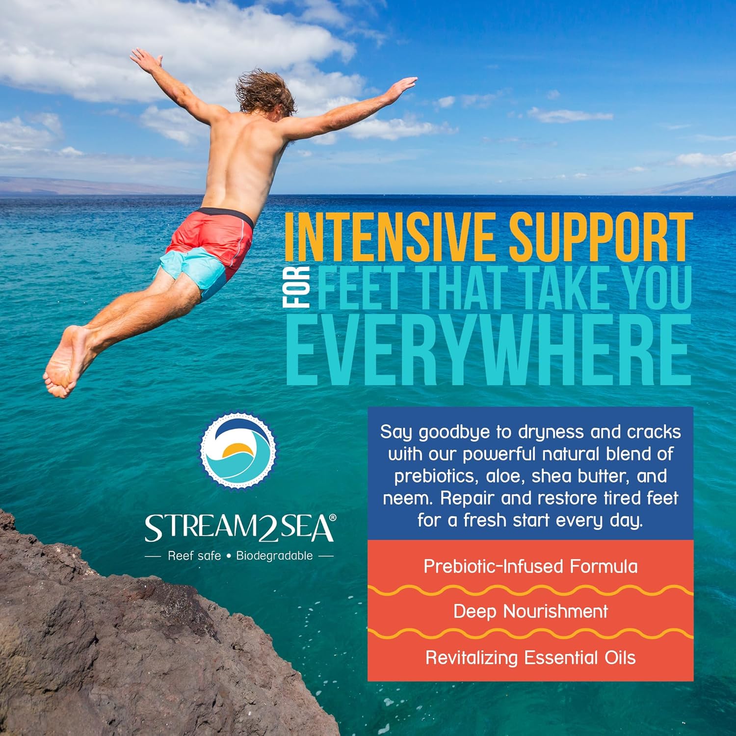 STREAM 2 SEA Active Foot Cream, Intensive Support for Active & Often Wet Feet - Softens Cracked Heels, Calluses & Dry Skin, Enriched with Neem and Tea Tree, Fast-absorbing and Non-greasy - 3 Fl oz