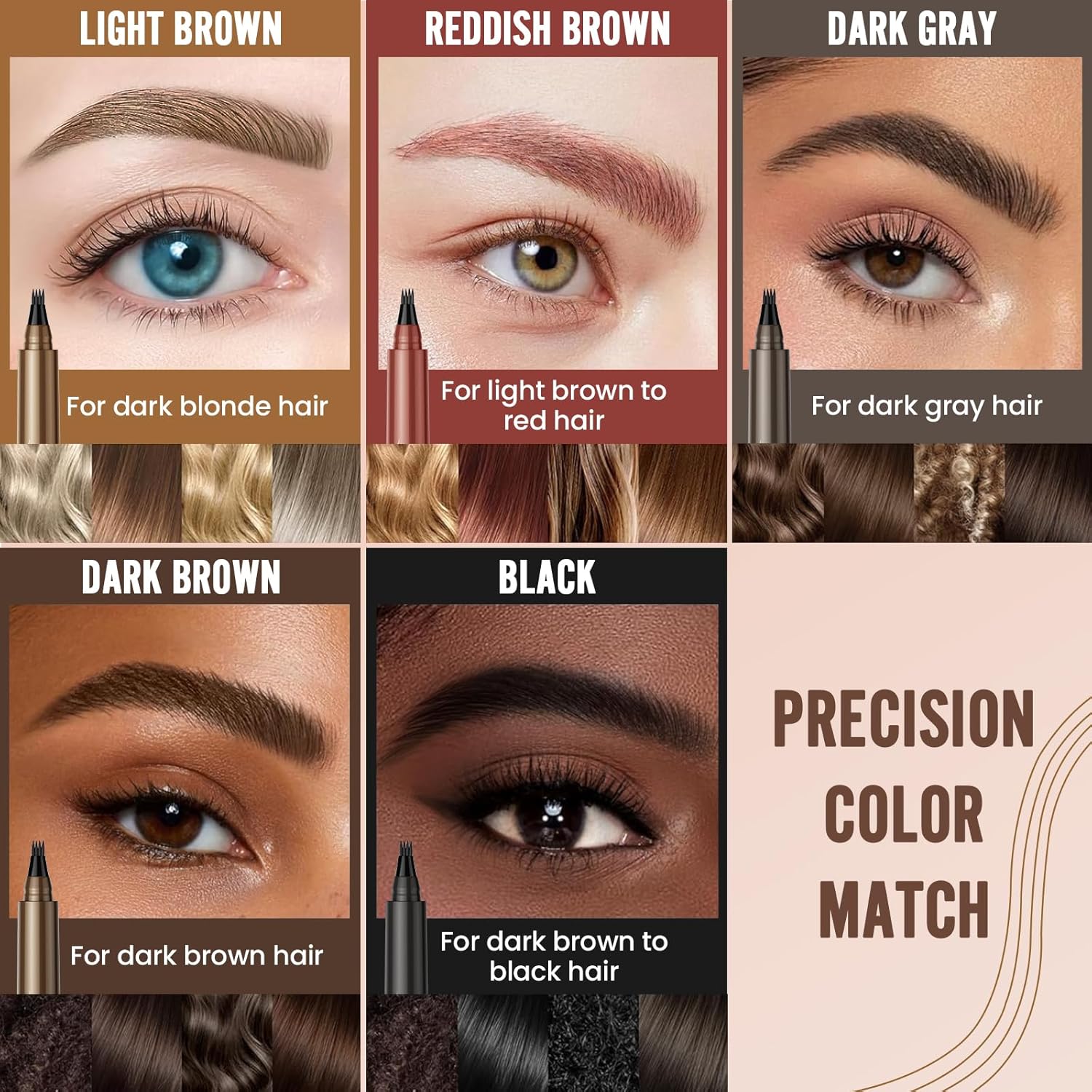- 【5 Classic Precision Color】With a diverse range of shades including Dark Brown, Light Brown, Black, Reddish Brown and Dark Gray, our eyebrow contouring pen offers a precision color match for every skin tone and makeup style. Whether you're aiming for a subtle enhancement or a striking accent, find your perfect hue and bring out your unique flair with every stroke.
